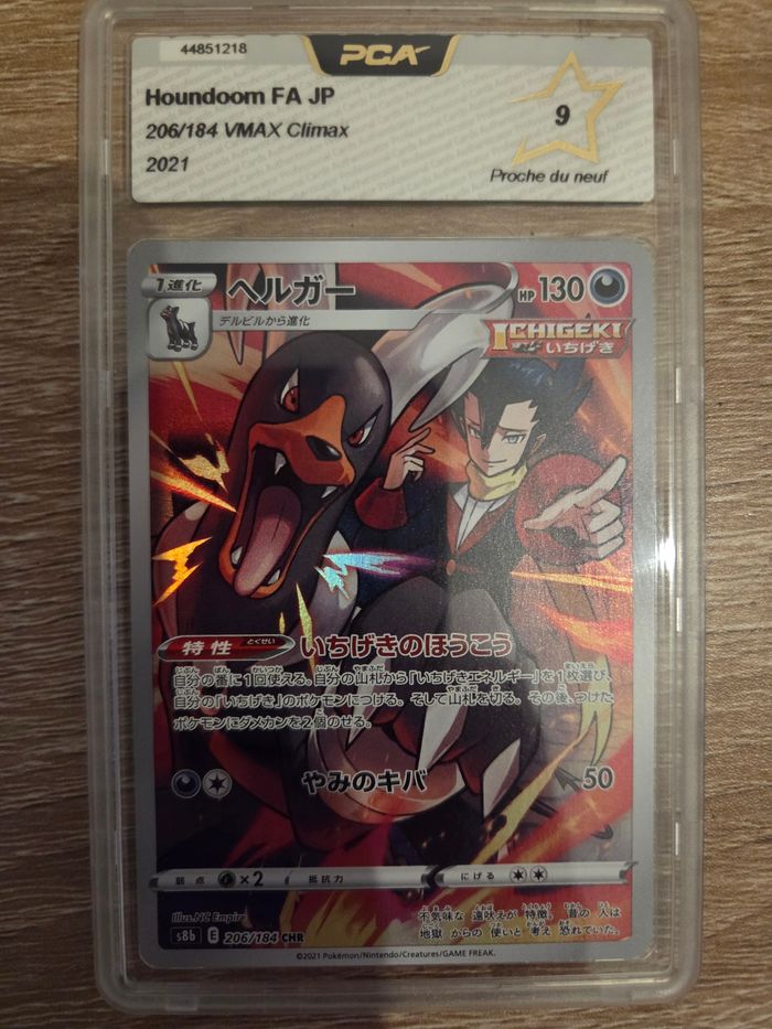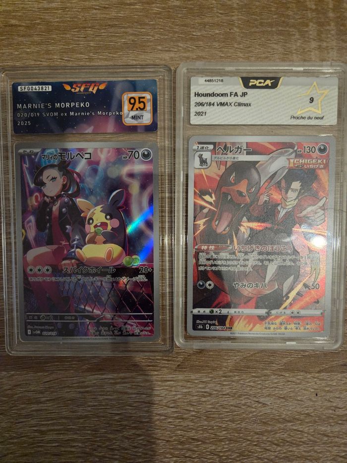 Je vends cette carte Pokémon japonaise de la collection Marnie's Morpeko, notée 9,5 sur 10 par les experts de la grading company SFG. - Type de produit : Carte de collection Pokémon - Personnage : Marnie's Morpeko - Édition : Japonaise - Grading : 9,5/10 (SFG) Et, également Houndoom FA JP, une édition spéciale de la série VMAX Climax sortie en 2021. - Type de produit : Carte de collection Pokémon - Personnage : Houndoom - Série : VMAX Climax - Année de sortie : 2021 - Certification : PCA 9 (Professionnelle Card Association)