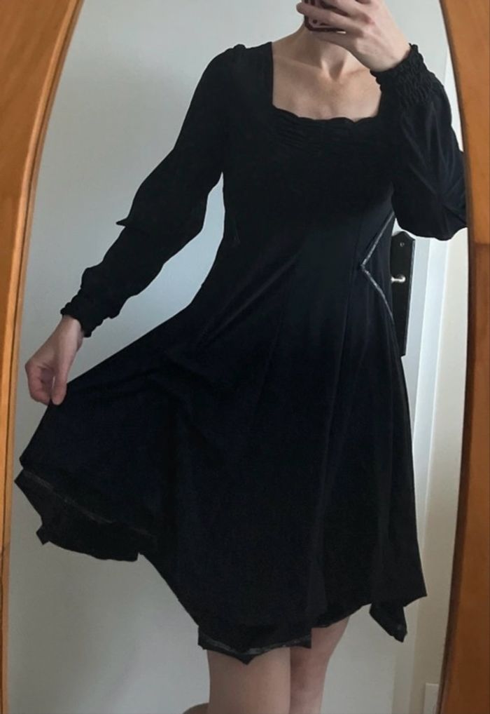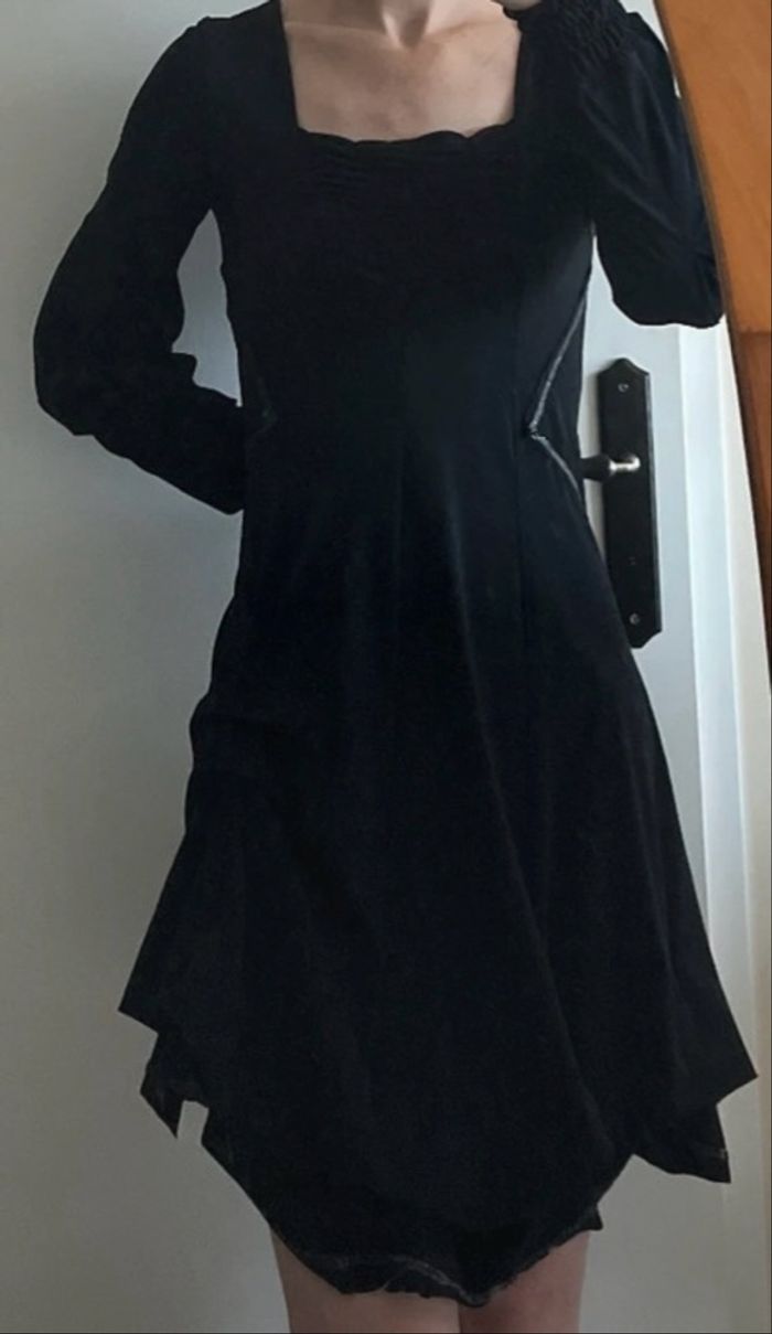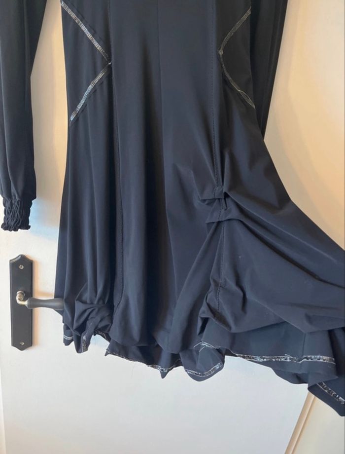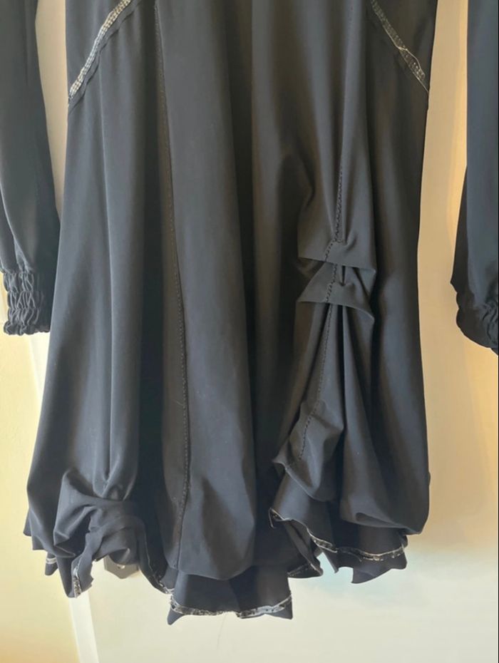 Très belle robe asymétrique Manches longues bouffantes resserrées aux poignets Arrive au dessus du genou avec « froufrou » au dessus du genou gauche Robe cintrée
