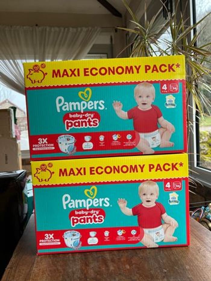 Code -15€: AMOUR25 Jusqu’au : 24/02/26 Lot : 2 cartons neufs. Variété : Pampers baby dry en PANTS. Taille 4 : Bébé 9 -15 kg Quantité : 188 (2*94) PANTS. #taille4 #couchetaille4 #pamperstaille4