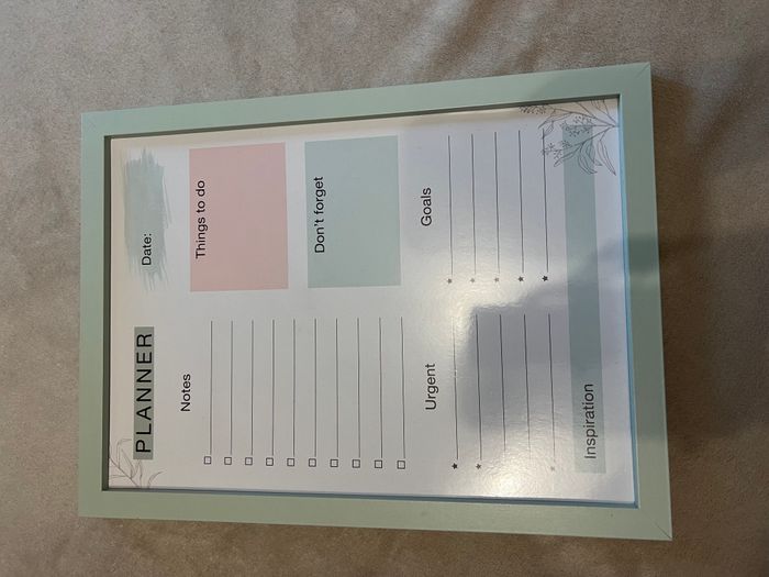 Cadre aimanté Planner – Vert – Organisation / Bureau 📝Action Pratique et coloré, ce cadre aimanté vert permet d’organiser facilement vos journées ! Il comprend plusieurs espaces : - Notes personnelles - Date du jour - Choses à faire - Choses à ne pas oublier - Priorités / Urgent - Objectifs - Inspirations Idéal pour le bureau, la maison ou pour planifier votre semaine avec clarté. 💡 État : Comme neuf, très peu utilisé. 📏 Merci de bien vérifier les informations et l’état à l’aide des photos, pour éviter toute mauvaise surprise. 👉 N'hésitez pas à regarder mes autres annonces pour grouper vos achats 😉 Une réduction automatique est appliquée pour les lots. Je n'accepte donc pas d'offres supplémentaires sur les articles bénéficiant déjà d'une remise.