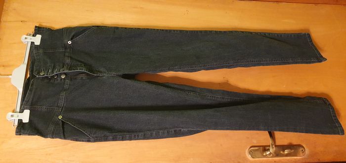 Jean noir taille haute, (ce qui fait une jolie silhouette), taille 48, 65% coton, 33% polyester, 2% élasthanne, stretch ceinture de 13cms de hauteur à la taille fermée par 4 boutons métalliques avec petite échancrure en V dans le dos, en dessous du boutonnage fermeture éclair de 10cms, 2 poches en biais dur le devant et 2 poches arrière avec motifs brillants brodés. Largeur taille haute 42cms, largeur taille 47cms , largeur bassin 54cms, hauteur entrejambe/taille 40cms, longueur entrejambe/ourlet 78cms, largeur jambe 19cms, longueur totale 110cms.