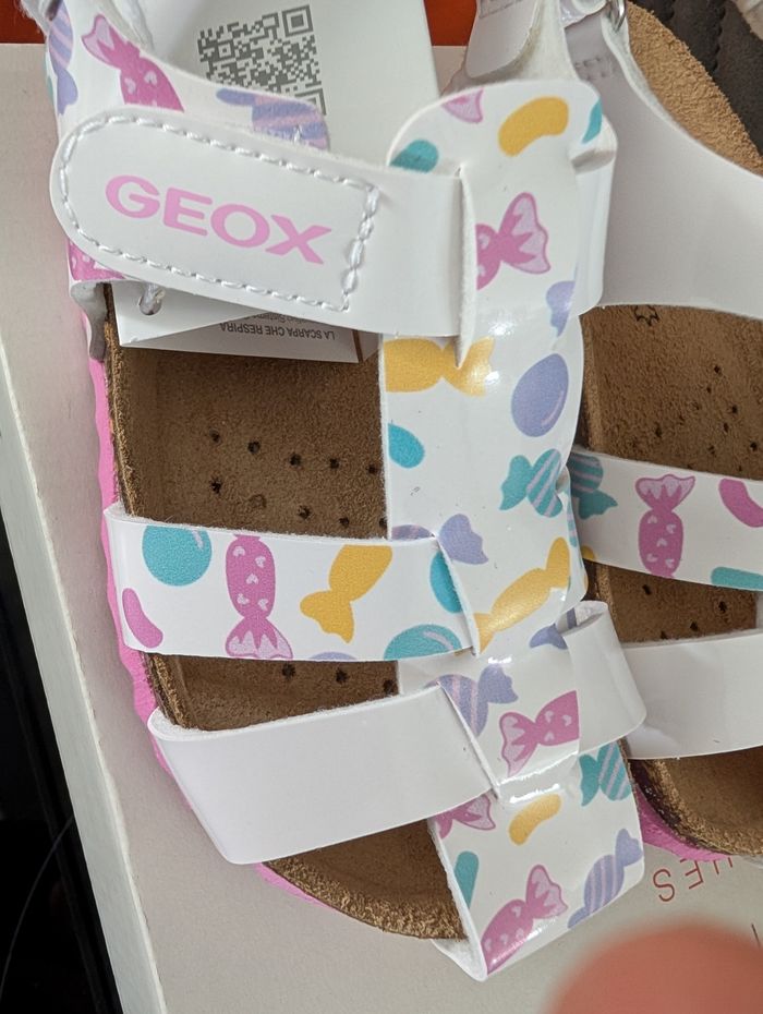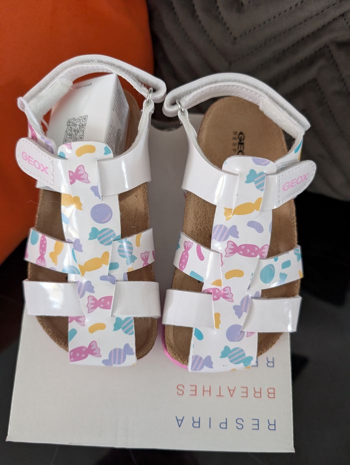 Je vends ces sandales d'été pour fille de la marque Geox, en taille 25. Neuf avec étiquette dans son emballage d'origine. Fermeture scratch . Souoples, semelle souple, mesures sur la photo pour donner des idées. - Type de produit : Sandales - Univers : Enfant - Marque : Geox - Pointure : 25 - Couleur : Multicolore. Blanc, déco bonbons multicolore. - Matière : Semelle intérieure en cuir - Condition : Neuf avec étiquette Très belles et confortables. N'hésitez pas à me contacter pour plus d'informations !