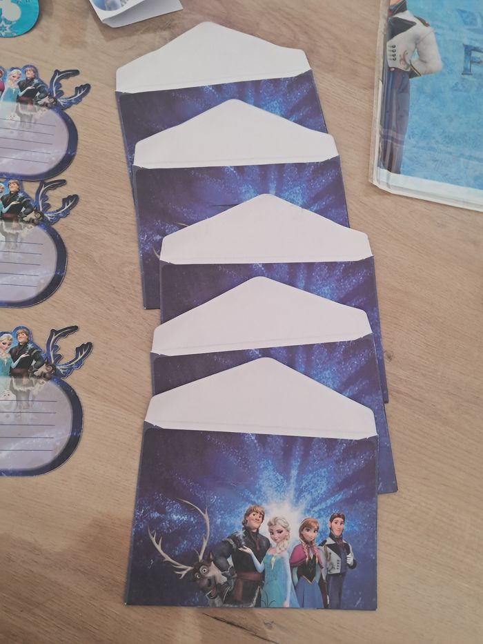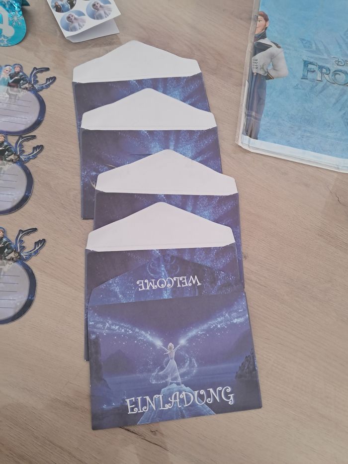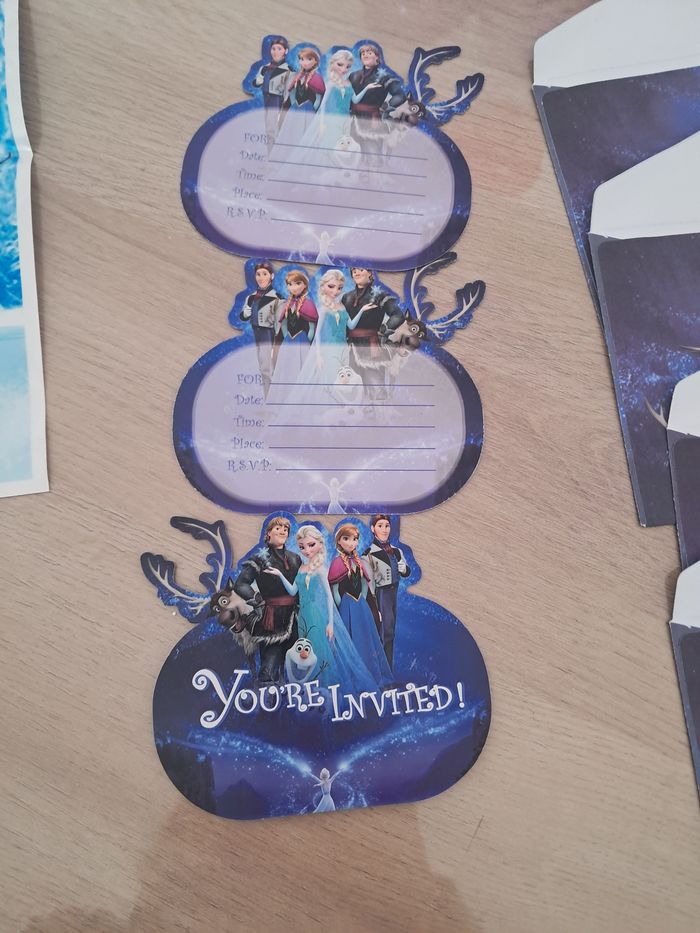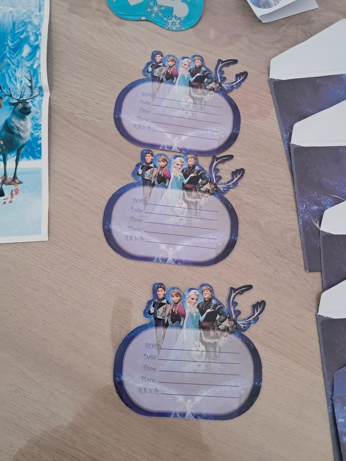 Lot de décorations anniversaire Thème reine des neiges Lot de 10 petites assiettes 1 ballon 1 nappe Cartes d'invitation et enveloppes Stickers Neuf