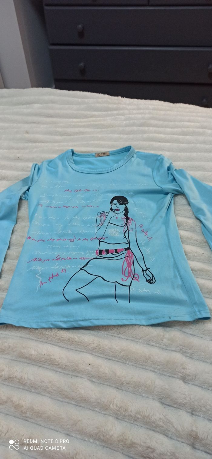 Vends un pull Bleu turquoise imprime t. 38 Jin bei
