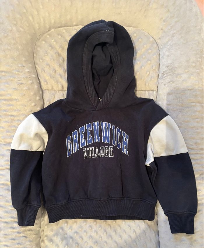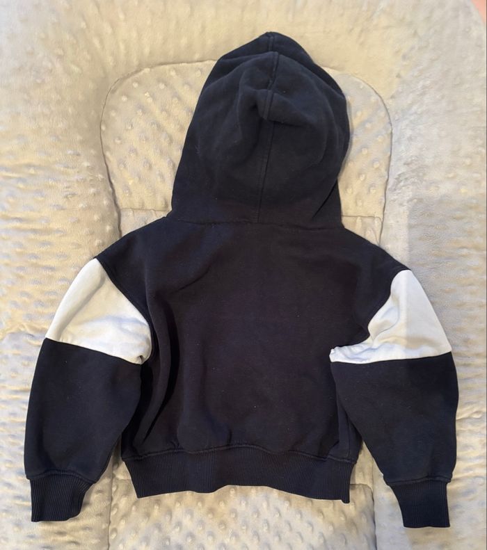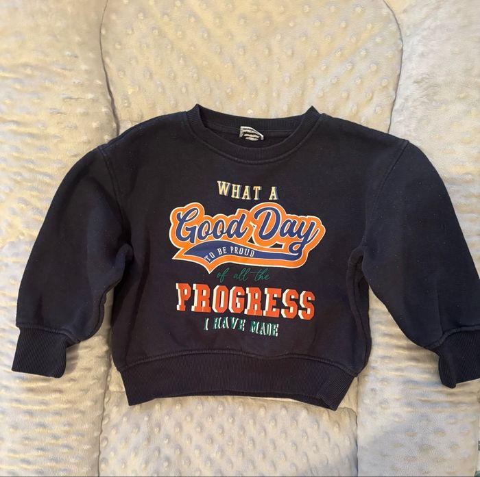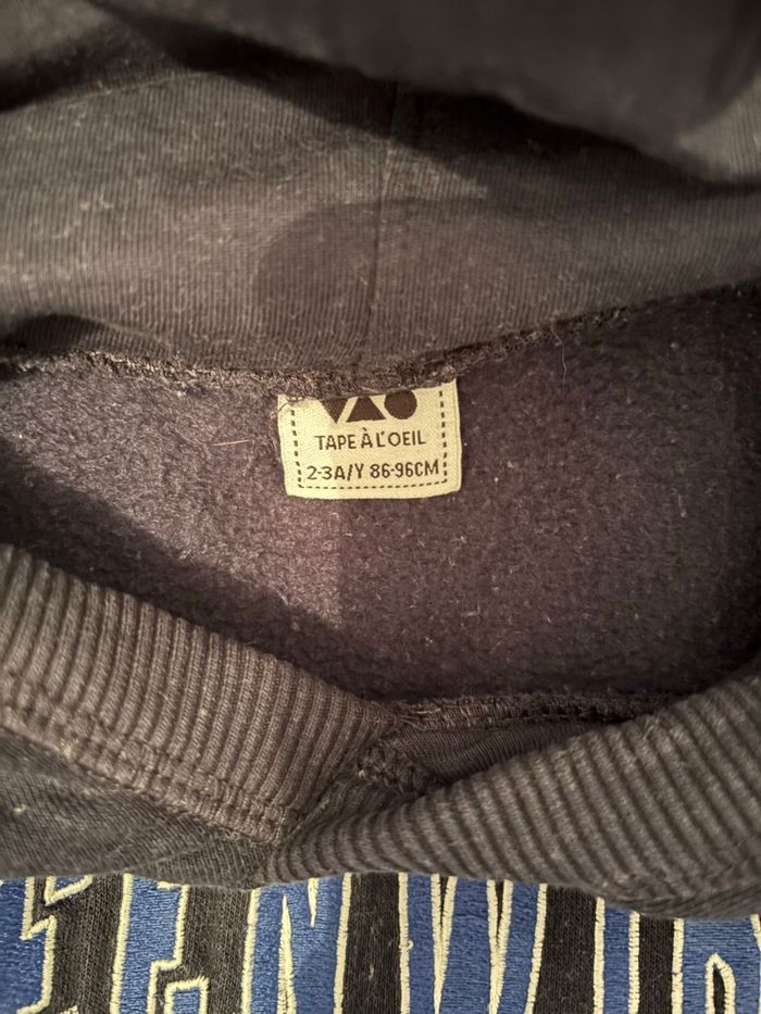 Lot de trois sweat-shirts Aucunes taches, aucuns trous Taille 2-3 ans - 86-96 cm Tape à l’œil Très bon état mise à part que les écritures sur le sweat-shirt noir se décollent à certains endroits voir photo