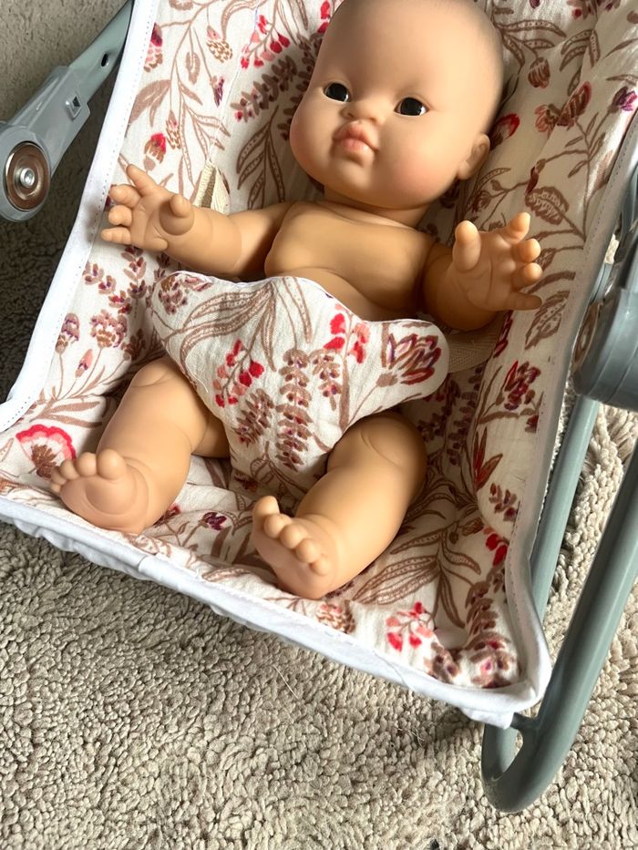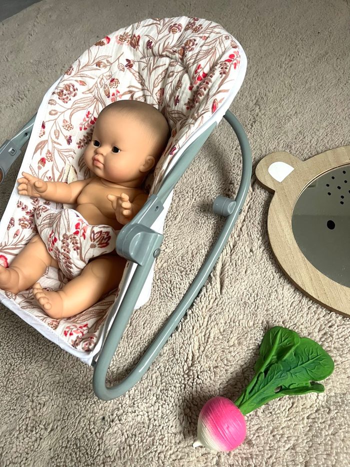 Transat pour poupée allant jusqu’à 42 cm Housse déhoussable et lavable Plusieurs possition possible, pied pour basculer le transat ou non