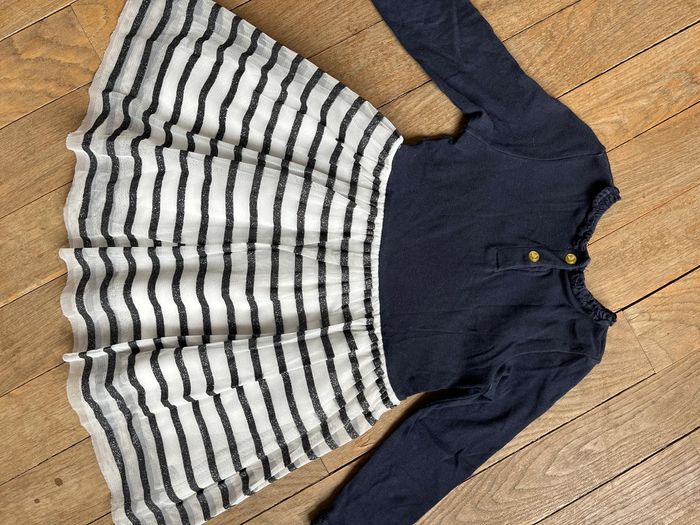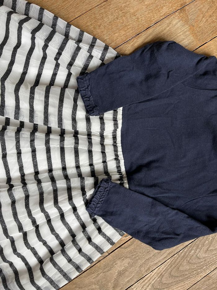Robe manches longues, haut marine, bas blanc recouvert de tulle blanc à rayures marine pailletées. Peu portée, très bon état, avec juste un mini défaut dans la couture en bas du tulle, qui ne gêne pas et ne se voit pas.