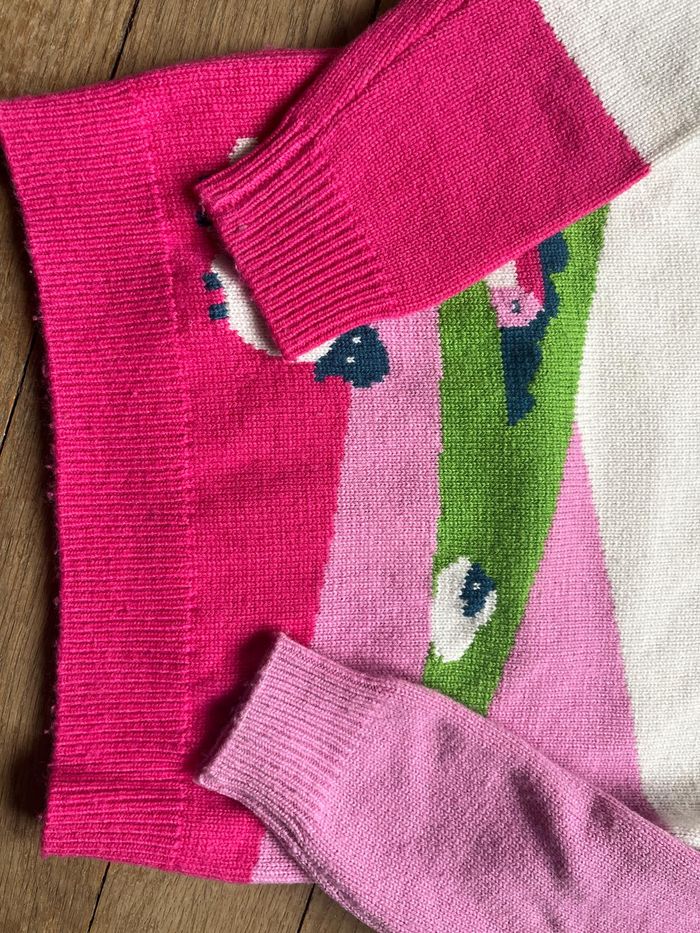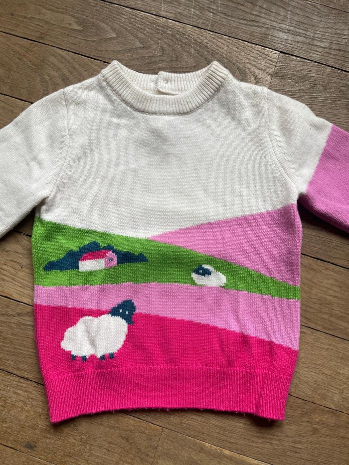 Pull d'hiver crème et différents tons de rose, avec motifs champêtre. Etiquette coupée, il est en 3 ans (les tailles plus grandes de ce modèle n'ont pas les boutons dans le cou). Matière chaudes (laine majoritaire, polyamide et un peu de cachemire) Peu porté, très bon état