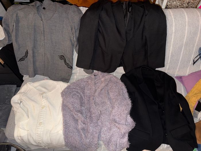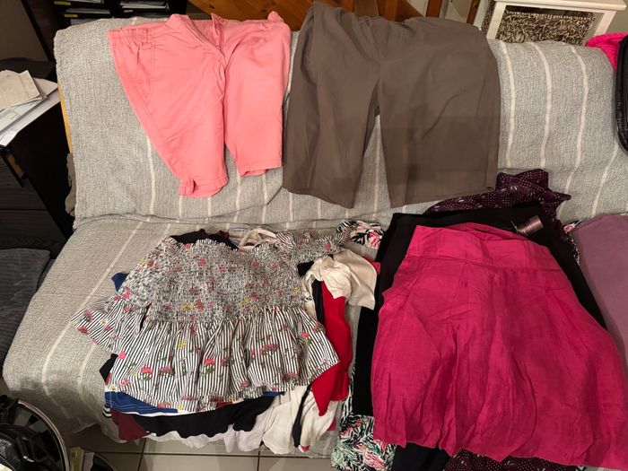 Comprenant 4 vestes (blazers) 6 pull 18 pantalons 17 robes 18 Tee-shirts 2 short 2 chemises 15 sacs neufs 5 portes monnaie neufs 2 pochettes neuves