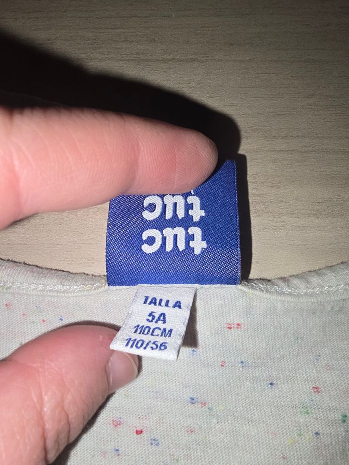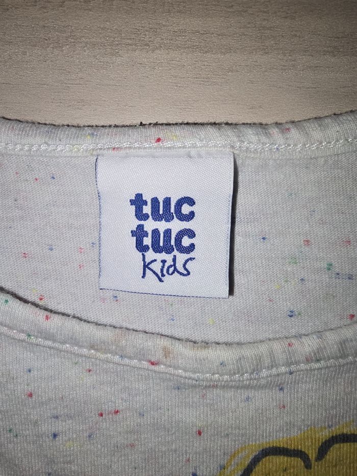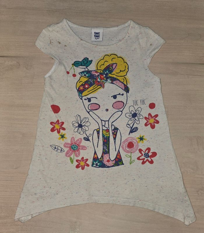 Débardeur Tuc Tuc avec un joli motif tête de fille fleurie. Plus long sur les cotés. Légères tâches sur les épaules, cf les 2 dernières photos, sinon le reste est nikel Taille : 5 ans, 110 cm Bon état