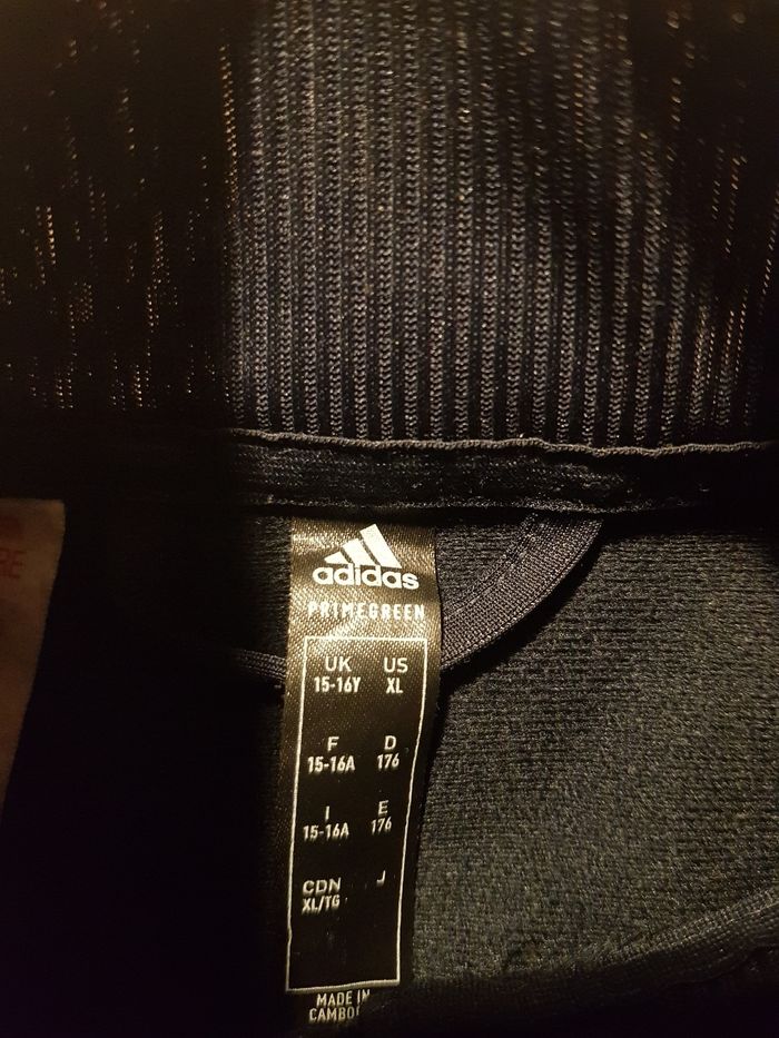 État :très bon état Marque : Adidas Modèle / Collection**: [si connu] Couleur : Noir, bandes blanches et bande rouge Taille : [TAILLE] Caractéristiques : zip central, col montant, logo Adidas sur la poitrine Poches: 2 poche avant