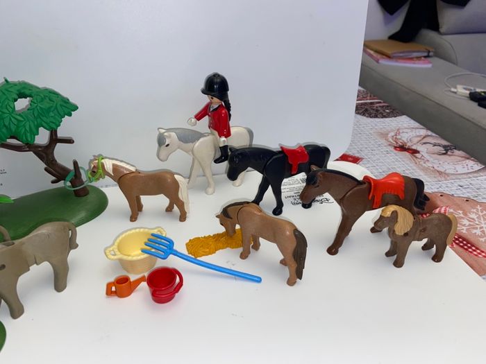 Lot chevaux cheval âne poulain playmobil Cavalière Avec accessoires scelle sceau arrosoir foin