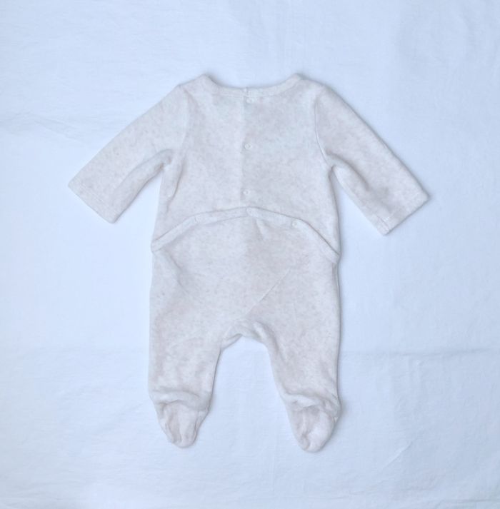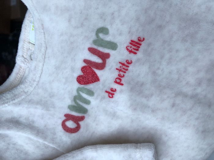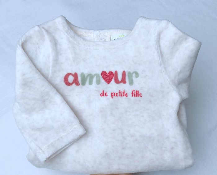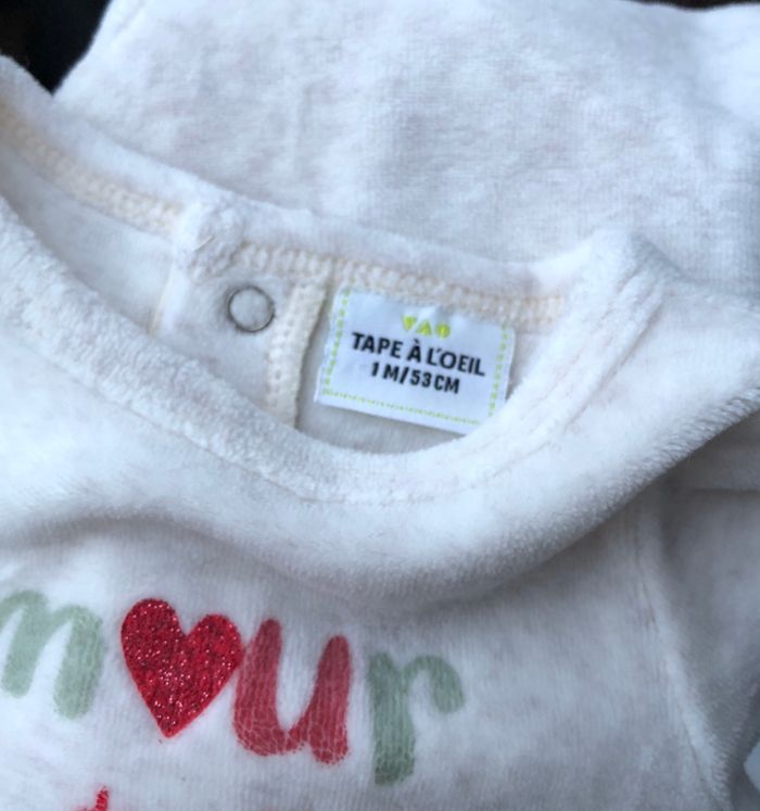 Pyjama hiver, grenouillère, dors bien Tape à l’œil, Taille 1 mois/ 53 cm. En velours crème moucheté gris clair, Inscription/ message avec un cœur à paillettes « amour de petite fille ». Ouverture par pressions à l’arrière. En excellent état, sans trou ni tache, le velours est comme neuf. 🌸 Vous aimez cet article ? N’oubliez pas de visiter le reste de mon dressing en filtrant les tailles.