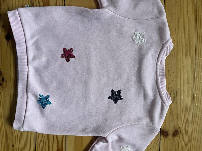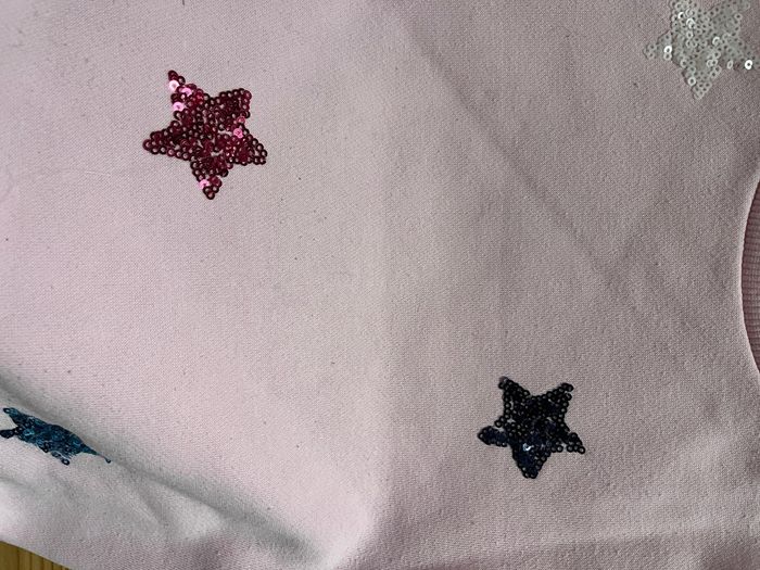 Sweat rose à étoiles en sequins Très bon état. Une très légère ombre devant, voir photo
