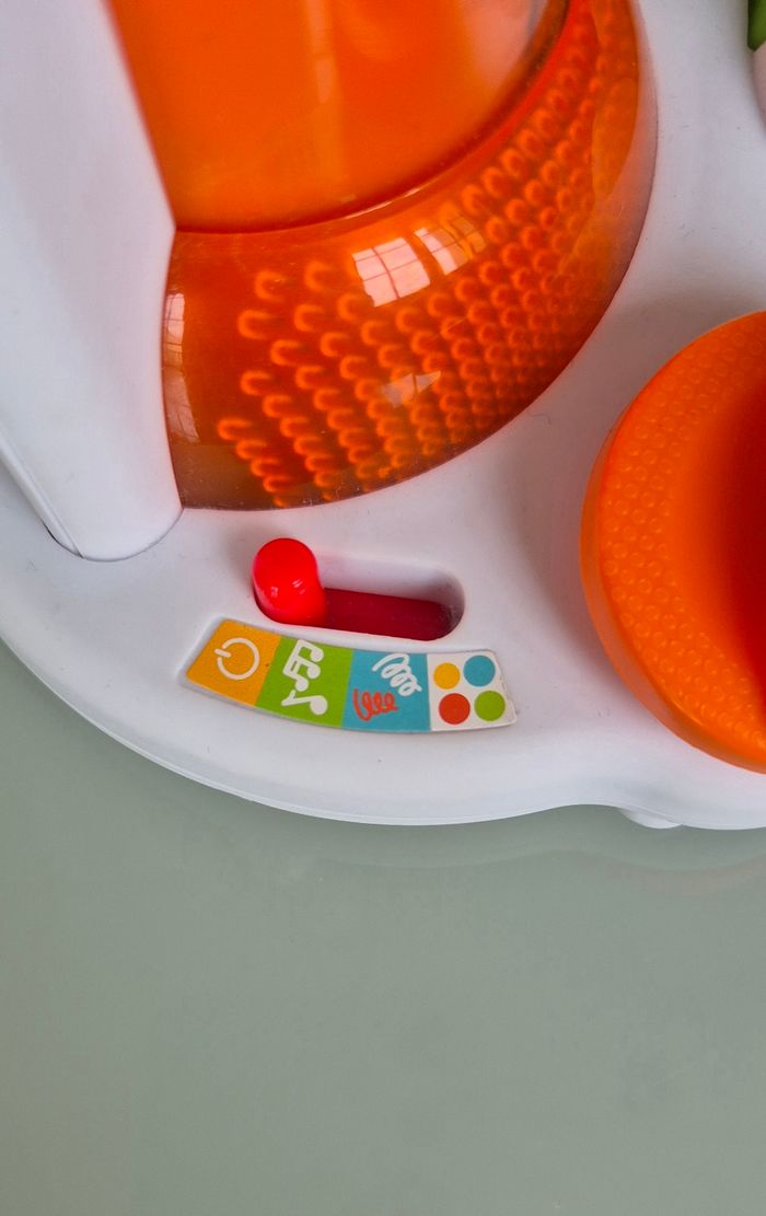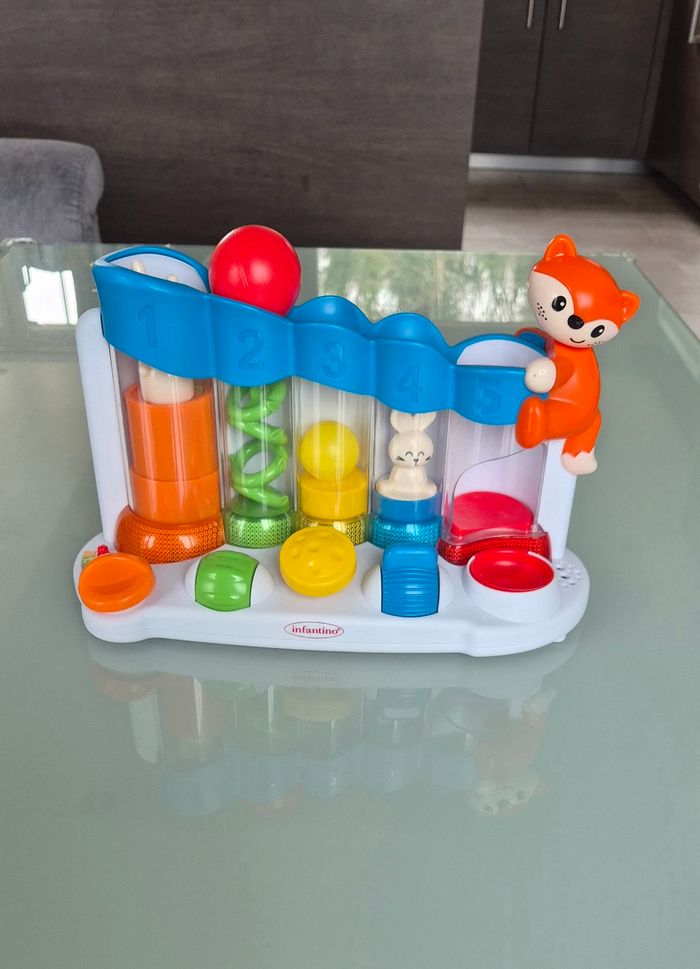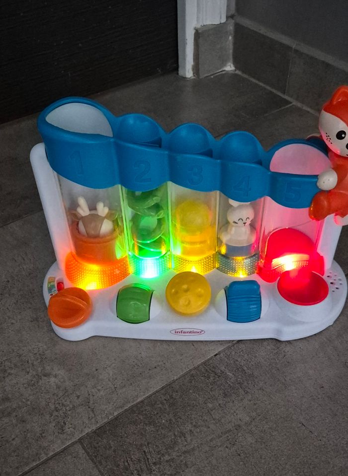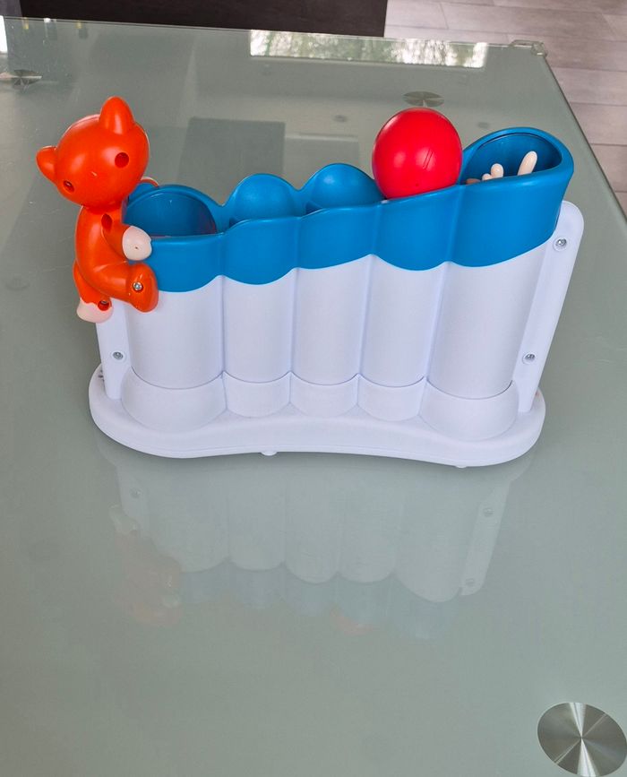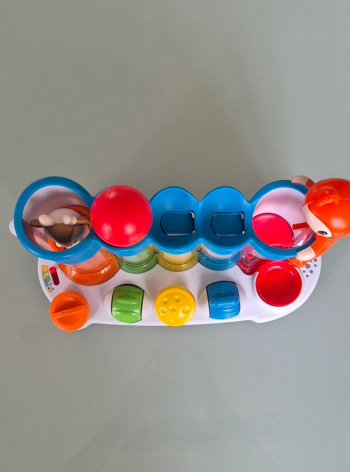 Sensoriel, chaque bouton déplace la balle au tube suivant. 2 niveaux sonores, plusieurs sons différents Très peu servi