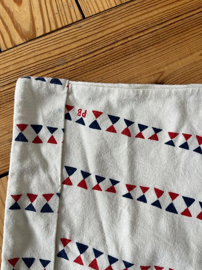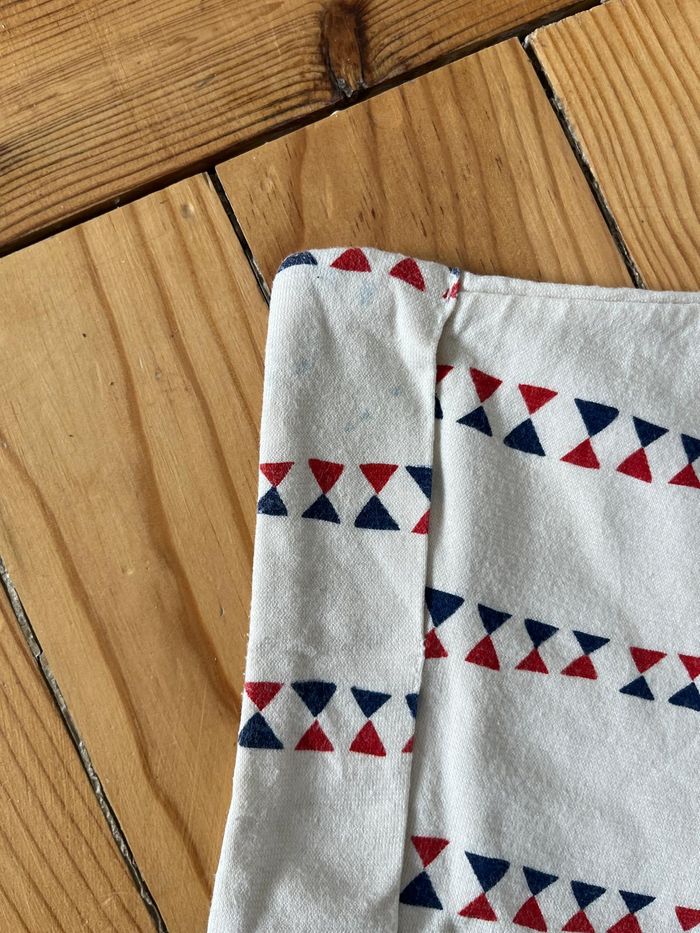 Deux robes à manches courtes Une crème à motifs rouges et bleus, tissu en très bon état mais petite taches montrées en photo. Une rayée blanc et bleu, très bon état