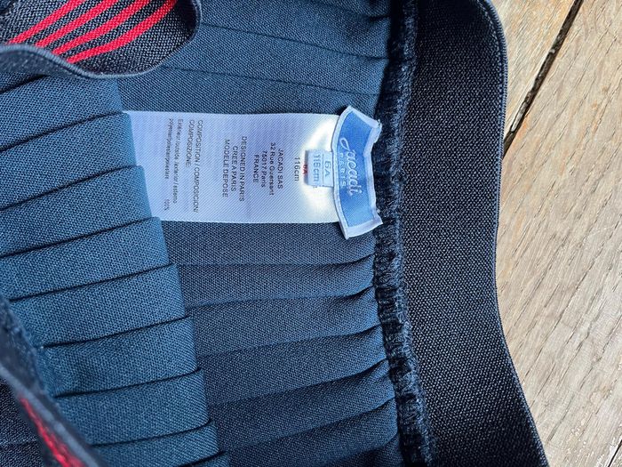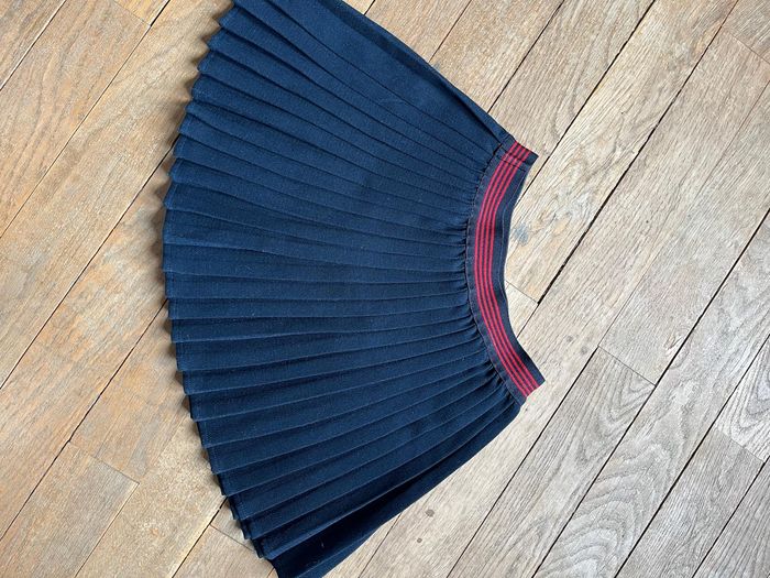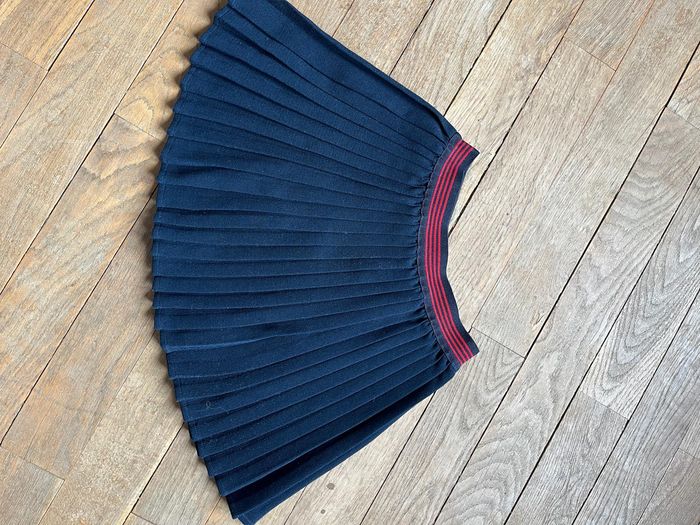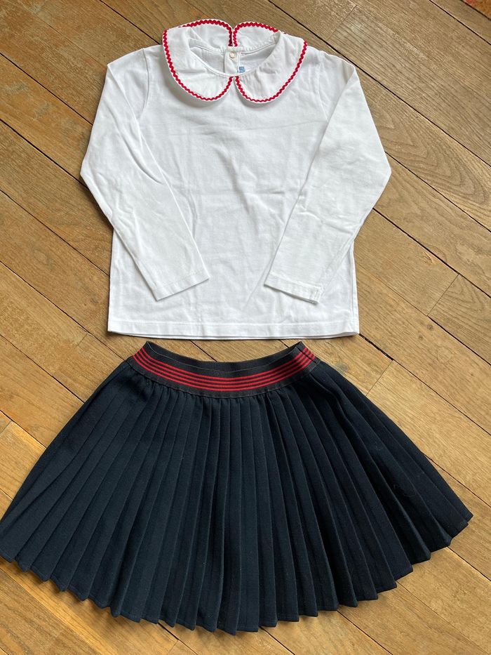 Tee-shirt manches longues blanc avec col claudine à liseré rouge. Excellent état Jupe plissée marine à ceinture élastique rayé rouge et marine. Très bon état