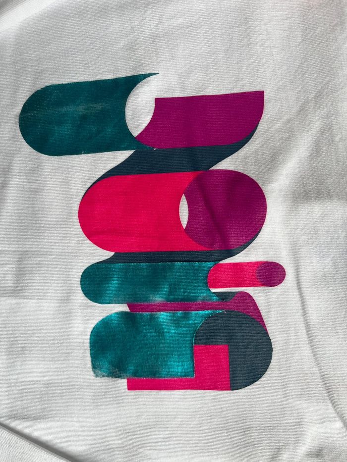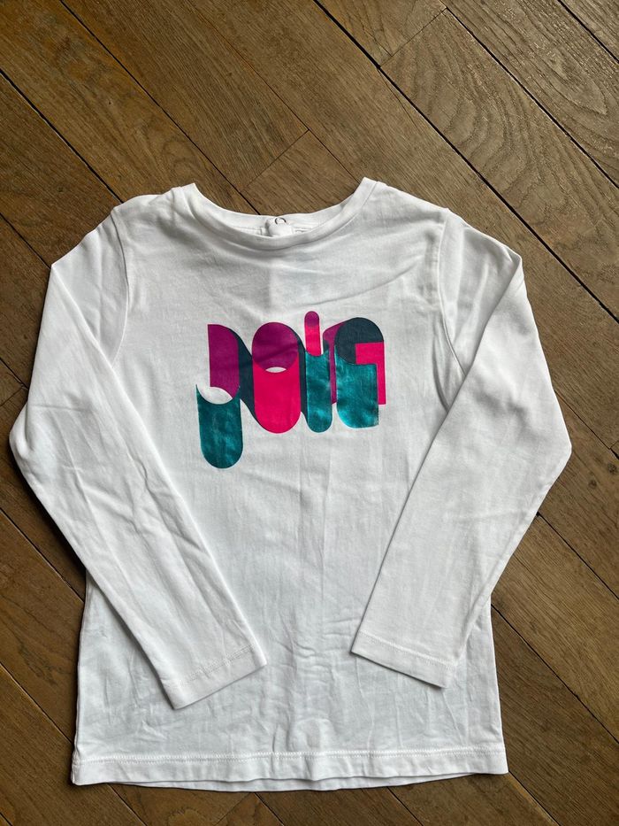 Tee-shirt manches longues blanc avec motif Joie. Peu porté, très bon état général, avec juste un très très léger défaut sur le motif, voir photo 3.
