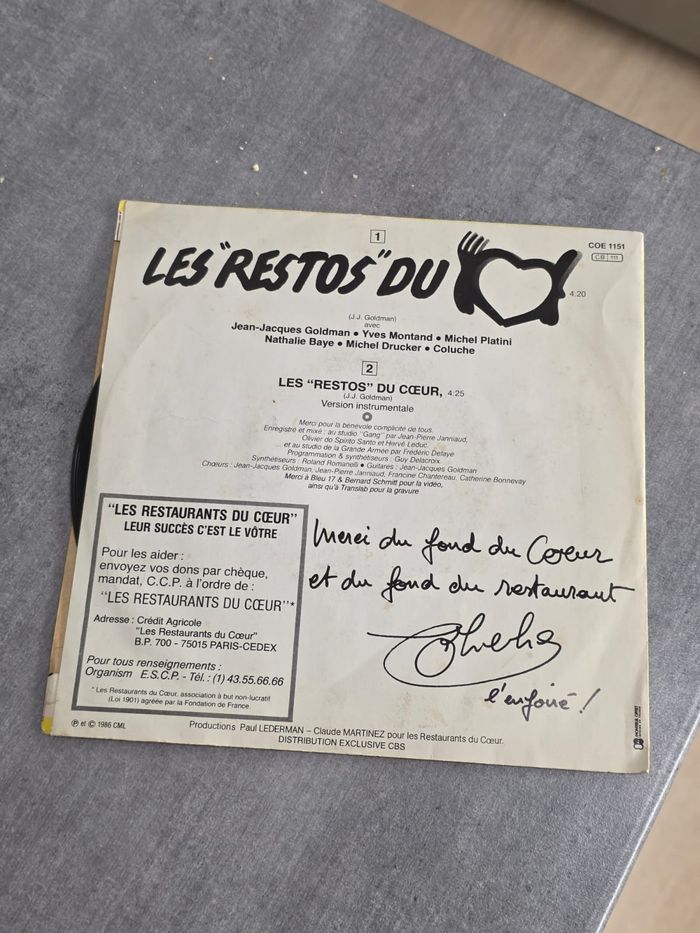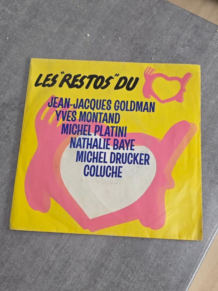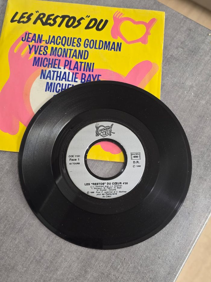 🎵 45T – Les “Restos” du Cœur (1986) Artistes : Jean-Jacques Goldman, Yves Montand, Michel Platini, Nathalie Baye, Michel Drucker, Coluche Titre : Les “Restos” du Cœur Format : Vinyle 45 tours Année : 1986 Label : CBS Pays : France 📀 Détails • Face A : Les “Restos” du Cœur – 4:20 • Face B : Version instrumentale – 4:25 • Disque emblématique au profit des Restaurants du Cœur ℹ️ À savoir • Édition originale de 1986 • Objet de collection / souvenir historique de la chanson caritative française Envoi soigné. Livraison dans toute la France. D’autres produits disponibles sur la page vendeur.