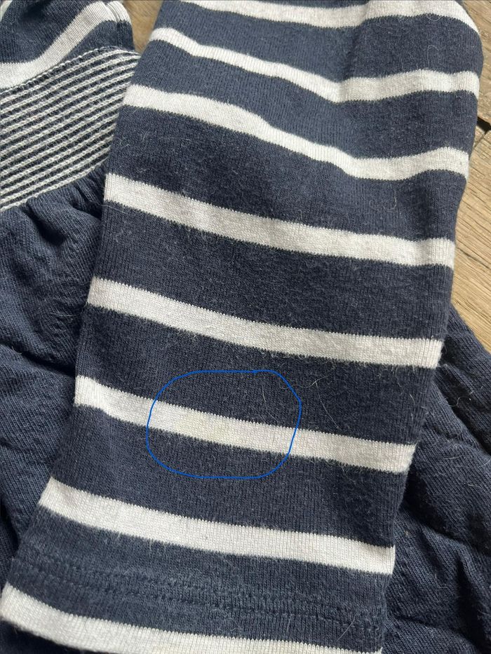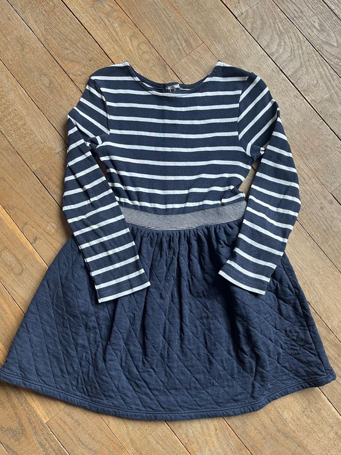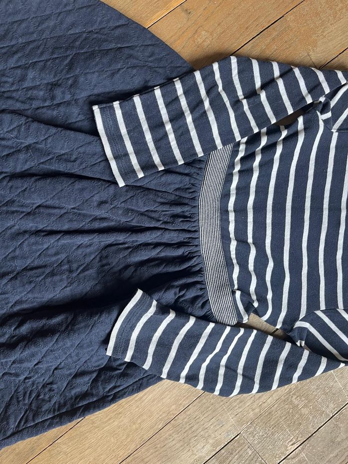 Robe manches longues, haut rayé marine et blanc et bas marine matelassé. Portée, très bon état, avec juste une toute petite ombre sur la manche gauche, montrée en photo 3, à peine visible mais je préfère la notifier.