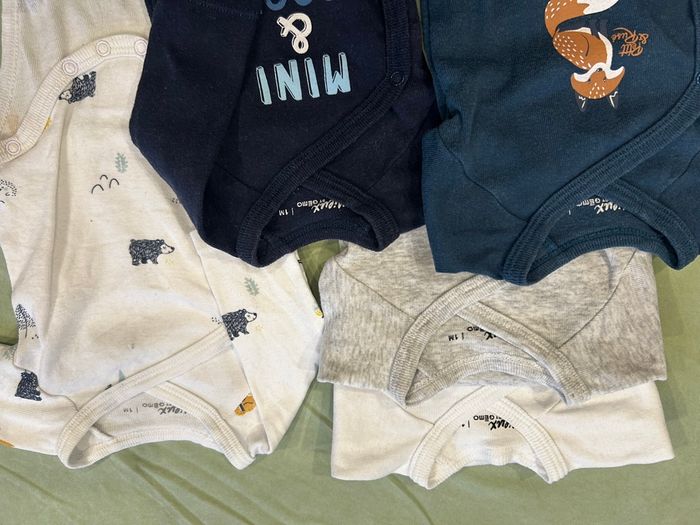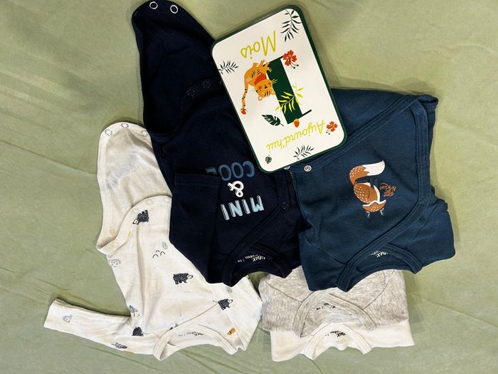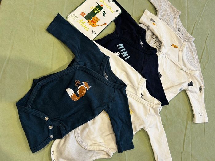 Lot de cinq bodies ouverture sur le devant marque mieux by gemo taille 1mois.