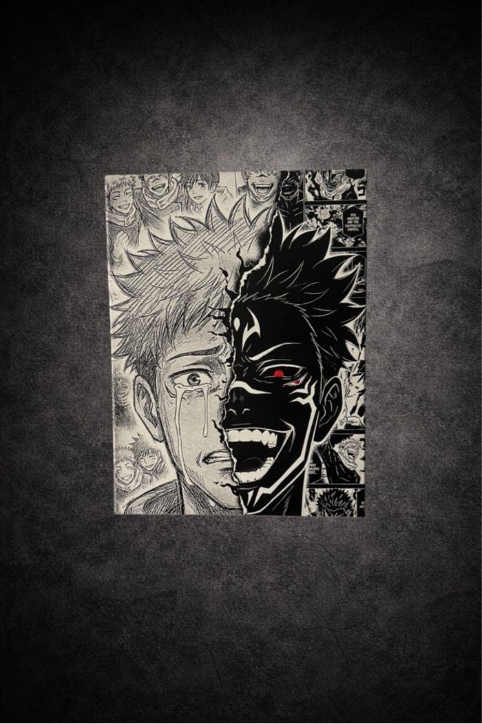 Tableau puissant inspiré de Jujutsu Kaisen, illustrant la dualité tragique entre Itadori et Sukuna. D’un côté, l’émotion et l’humanité du héros, de l’autre la rage et la cruauté du roi des fléaux. La composition en contraste noir et blanc, enrichie de détails issus de l’univers manga, rend cette œuvre particulièrement marquante. Idéal pour une décoration murale manga forte en symbolique, parfaite pour une chambre, un salon ou un setup gaming. Un tableau qui raconte une histoire et capte immédiatement l’attention. 📐 Dimensions : 30x40 cm 📦 Envoi rapide et soigneusement emballé Une pièce incontournable pour les fans de Jujutsu Kaisen et des scènes les plus intenses de la série.