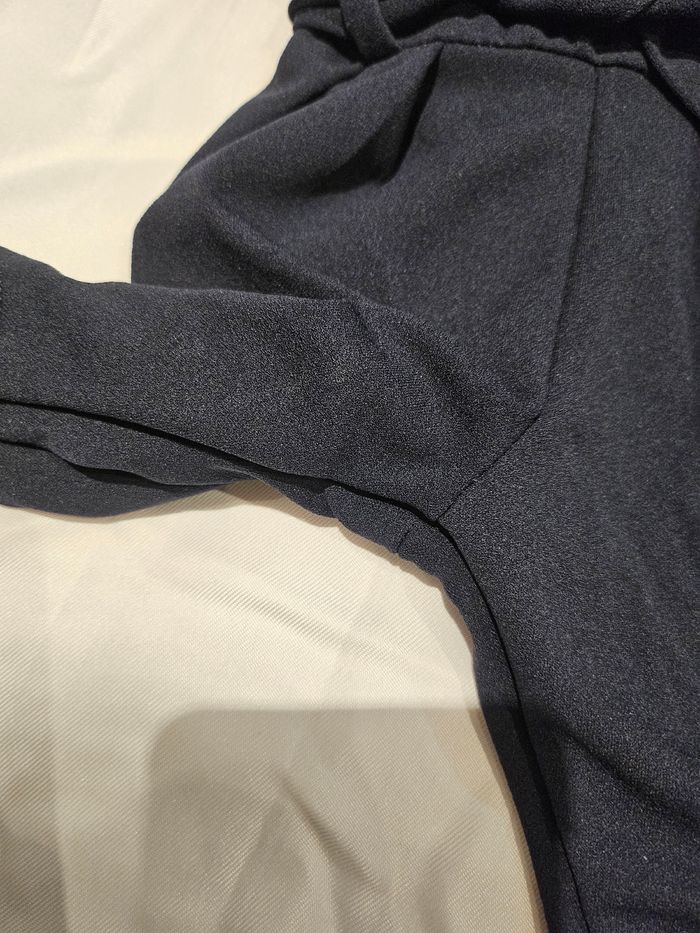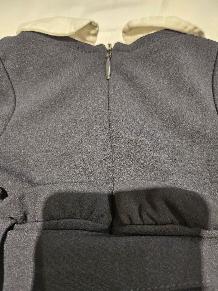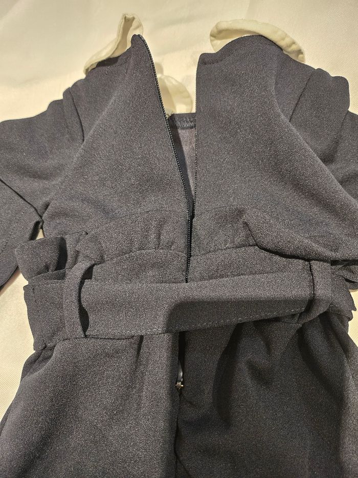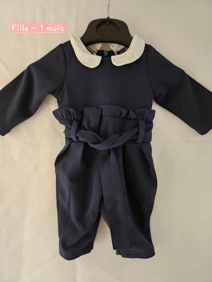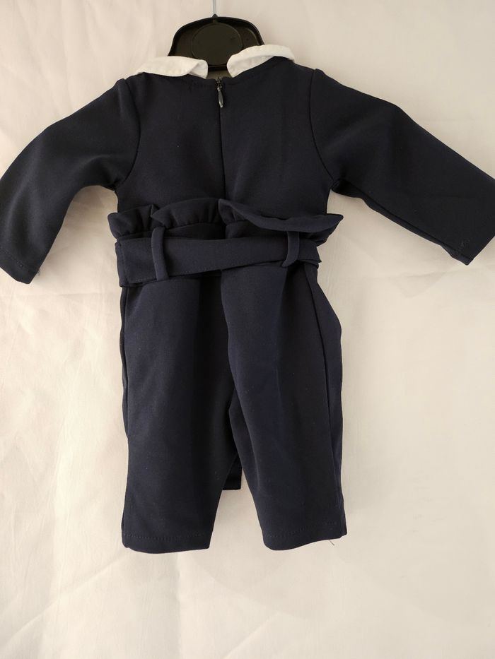 Combinaison manches longues marine avec col blanc. Ceinture à nouer. Pressions entre les jambes et fermeture éclair dans le dos. Marque : Kiabi Taille : 1 mois
