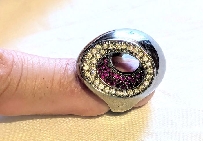 Bague "Chevalière" avec un Double Ovales Enfoncés et des Petites Pierres Blanches et Roses en Strass. Bijou Argenté Fantaisie pour les Femmes. ☑ Bague "Chevalière". ☑ "Double" Ovales. ☑ Ovales "Enfoncés". Spécifications: Matériel: Acier Petites Pierres (Blanches - Roses): Strass Taille de la Bague: Taille 50 (Env. 15,9 mm de Diamètre Intérieur) Dimensions du Gros Ovale: Env. 22 x 17 mm Couleur Dominante: Argenté Couleurs des Petites Pierres (Strass): Blanc - Rose Réf: ba84