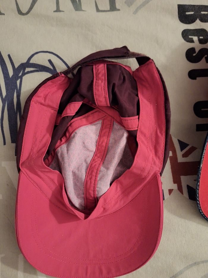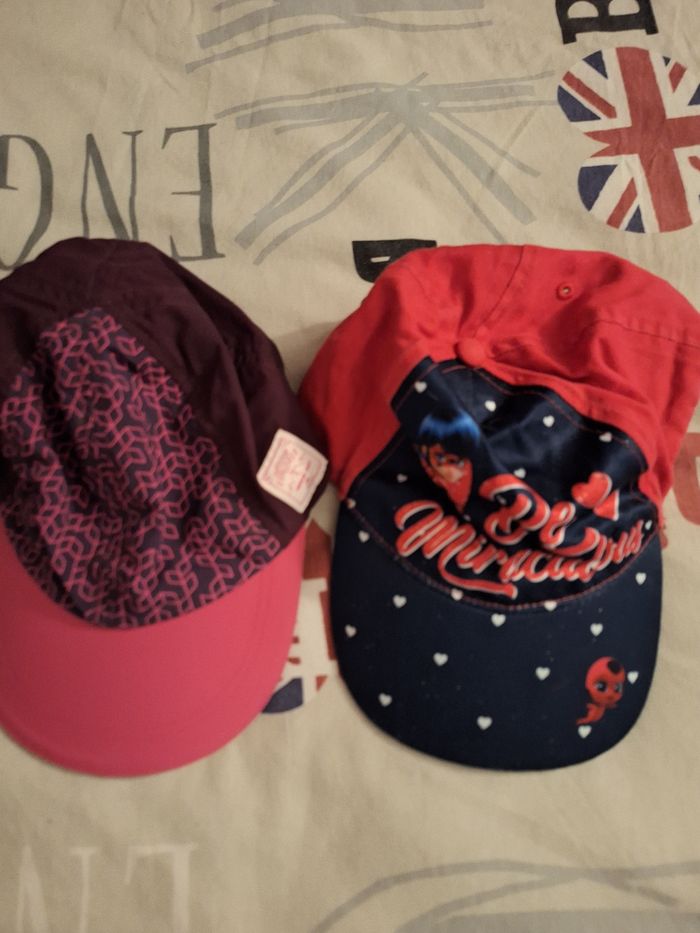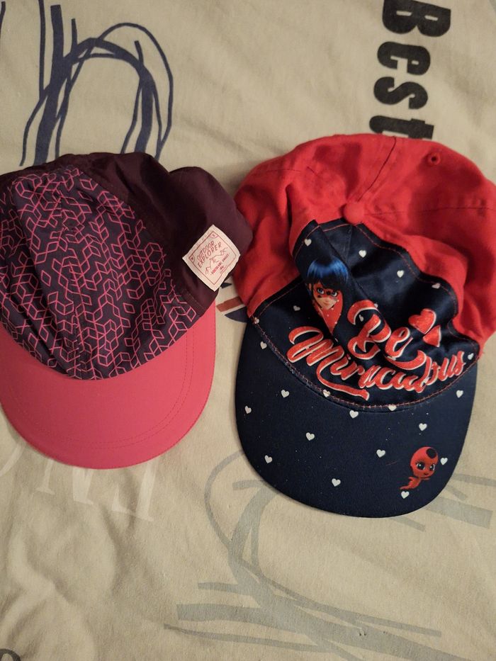 Lot 2 casquettes enfant fille 51 à 56 cm très bon état. Une viens de décathlon marque quecha et l'autre de lady bug.