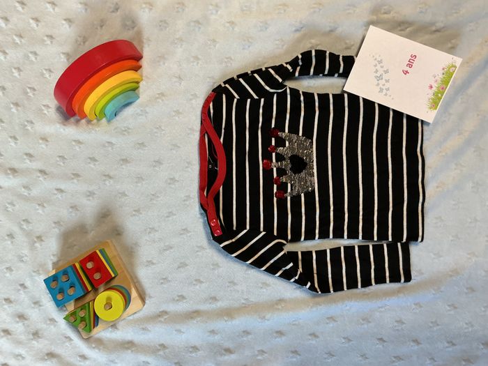 teeshirt manches longues noir rayé blanc dessin en perles à retourner devant 4 ans