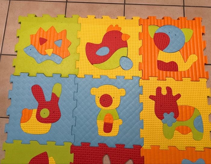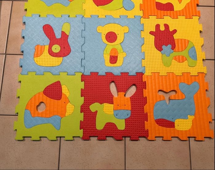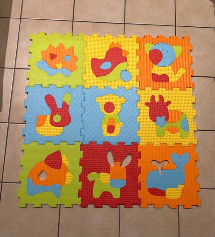 Lot de 9 dalles en mousse Avec animaux Manques quelques pièces (voir photos) Dimension d’une dalle : 30x30 cm