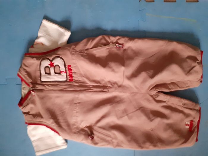 Vends salopette molletonné (boutons pressions entre jambes, fermeture éclair sur le devant) et tee-shirt manches courtes (boutons pression dos), 3mois