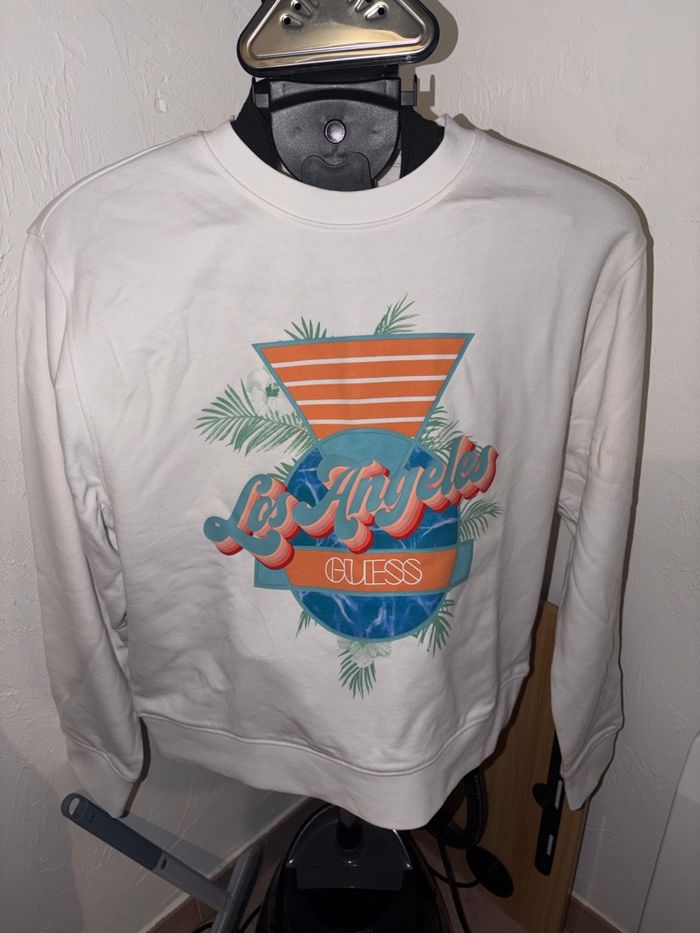 Sweat GUESS Los Angeles original, neuf avec étiquette, jamais porté. Couleur : blanc laille : L Matière confortable et de bonne qualité, coupe moderne. Design rétro Los Angeles avec logo Guess, parfait pour un look casual/streetwear. Aucun défaut, état impeccable. Idéal pour cadeau ou pour se faire plaisir