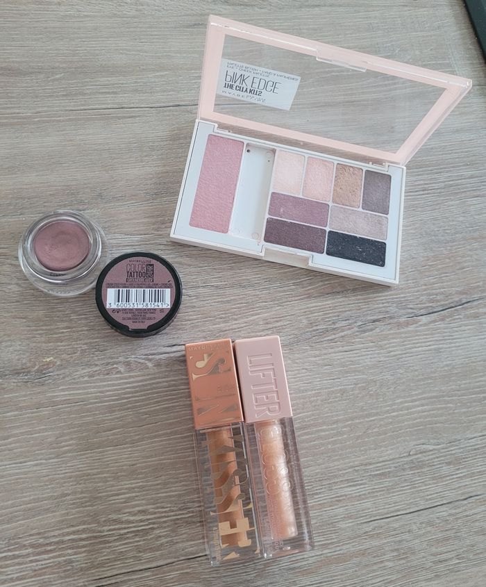 Exceptionnel lot Maybelline makeup : 8 fards à paupières , 1 blush Palette PINK EDGE splendide dont il ne manque que l'highlighter Blush Sun Kisser, teinte 12 Summer in the city, un brun orangé doré Gloss Lifter, teinte 20 Sun, un transparent nacré et doré Color Tattoo eyeshadow crème teinte violine rose satiné, dupe de Charlotte Tilbury Vous êtes splendide pour 7,50 euros !