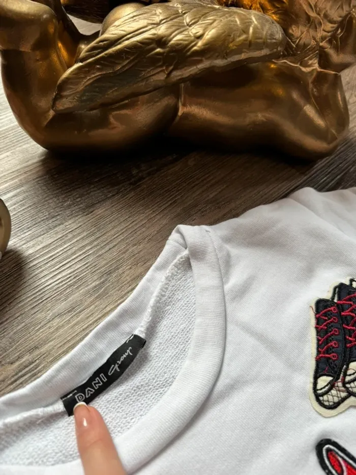 Bonjour à tous ! 😄 🔍 Description : Pull col rond avec imprimé/stickers. Acheté en Italie. 95% Coton. 🌟 État : Très bon état 📏 Taille unique (convient à un XS/S) 📐 Dimension : largeur 38 CM / longueur 56 CM 🛍️ Marque : Dani Group 📦 Livraison : chronopost (shop2shop) et mondial relai en priorité pour un envoi rapide. Soigné ✅ ❗️ Note importante : Pas d’échange, pas de photo sans sous-vêtement. Veuillez poser toutes vos questions avant d'acheter. 🚫 Pas sérieux s'abstenir !