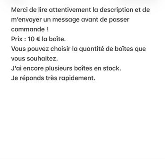 Merci de lire attentivement la description et de m’envoyer un message avant de passer la commande ! Prix : 10 € la boîte. Vous pouvez choisir la quantité de boîtes que vous souhaitez. J’ai encore plusieurs boîtes en stock. Je réponds très rapidement.