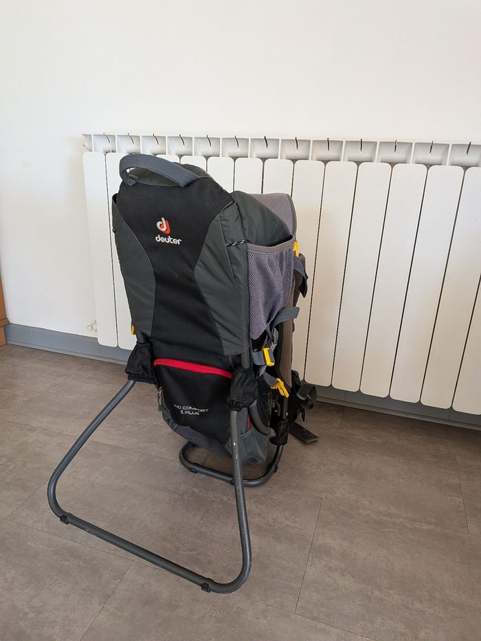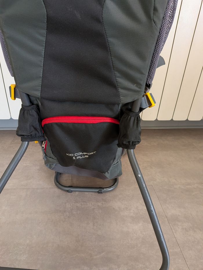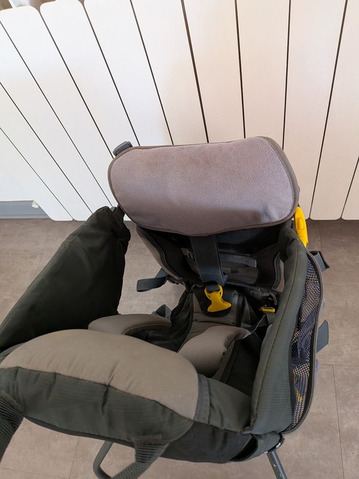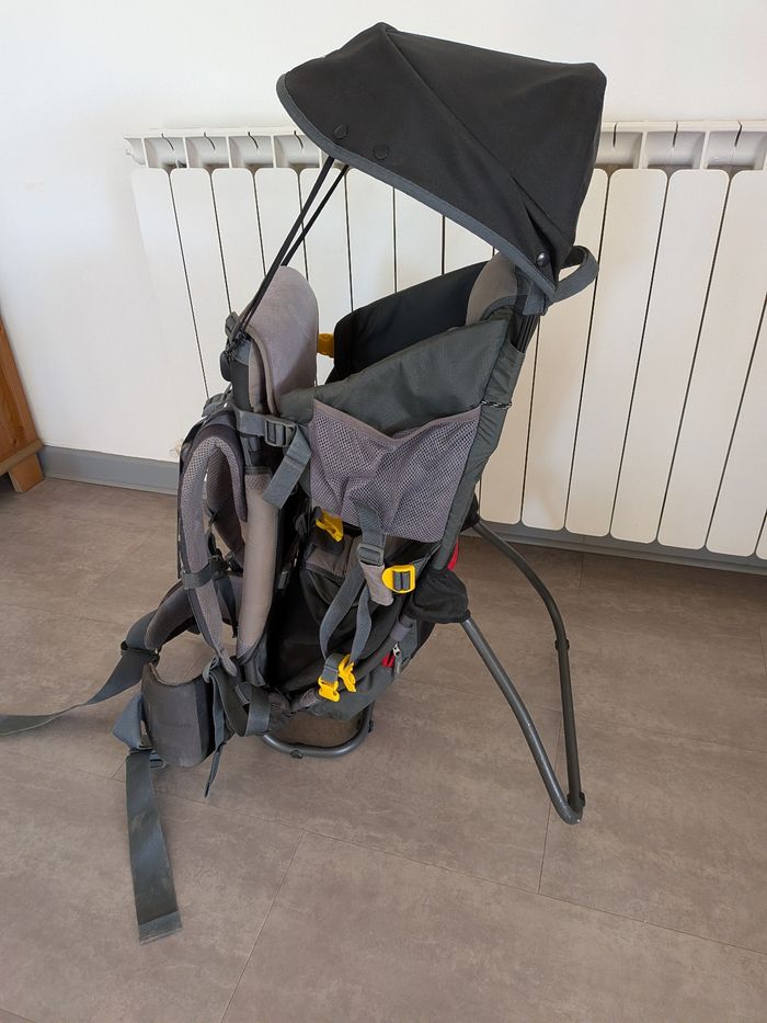 spécial randonnée Enfant jusqu'à 18 kilos + 4 kilos de charge Harnais 5 points d'attache. Entrée latérale, hauteur/longueur bretelles réglables,siège renforcé et réglable Dos ventilé, dos et bretelles réglables, sangle poitrine, repose mains. Poids 2,3 kg Très bon état