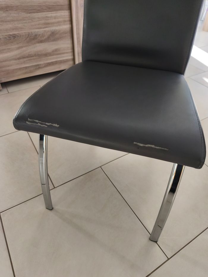 Bonjour je vends un lot de 6 chaises grise certaines sont abîmées au niveau de l assise et des pieds voir sur les photos. A venir chercher sur place pas d envoi trop volumineux.