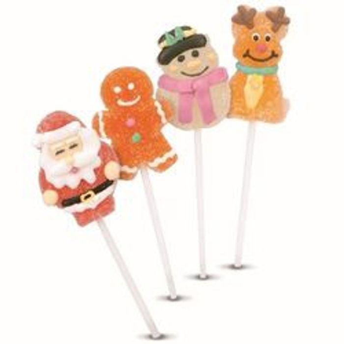 mini sucettes gélifiées emballées individuellement. Modèles assortis : père-noël, sapins décorés, bonhomme de neige, renne.