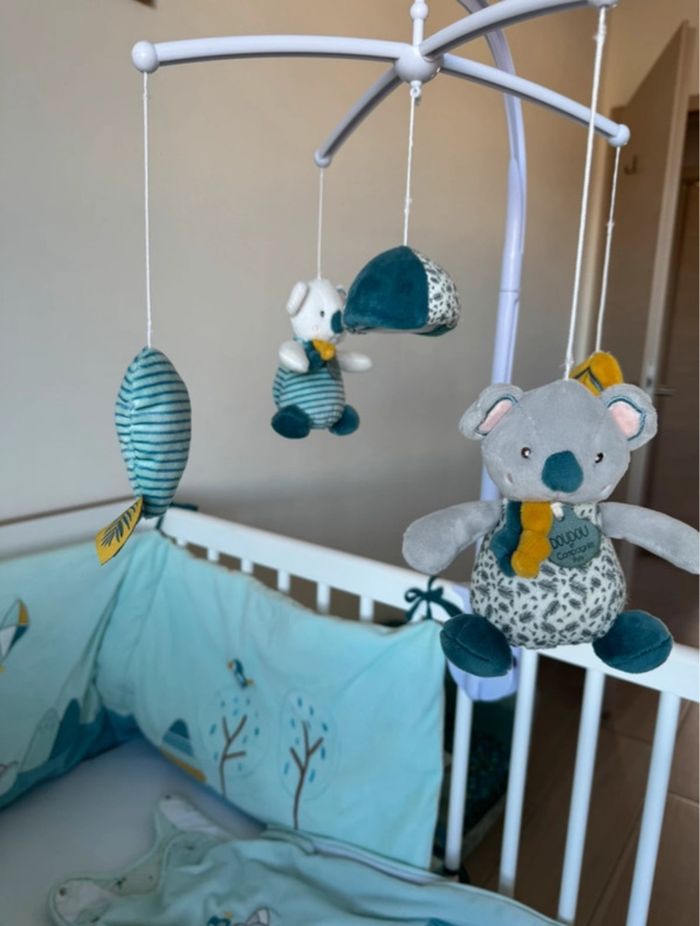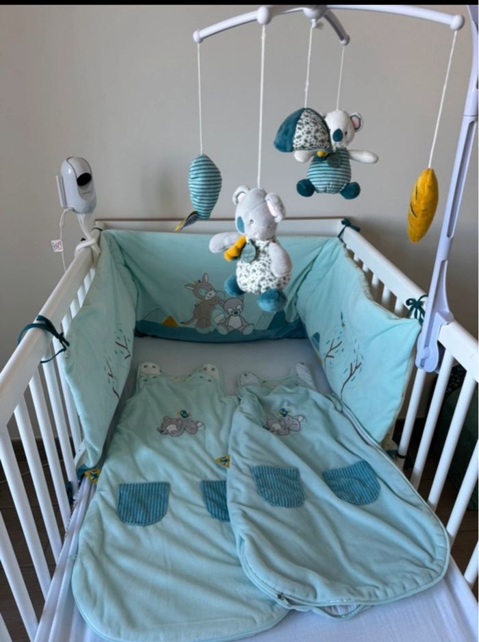 Ensemble NATTOU 2 turbulettes taille 1 en très bon état 1 tour de lit en bon état simplement 2 ficelles ont était cousu ça ne se voit pas Ainsi qu’un mobile de la collection koala doudou et compagnie abîmé qui ne tourne plus mais sert de deco je le donne Le tout pour 50 euros (1 turbulette vaut 40 euros pièce ! )