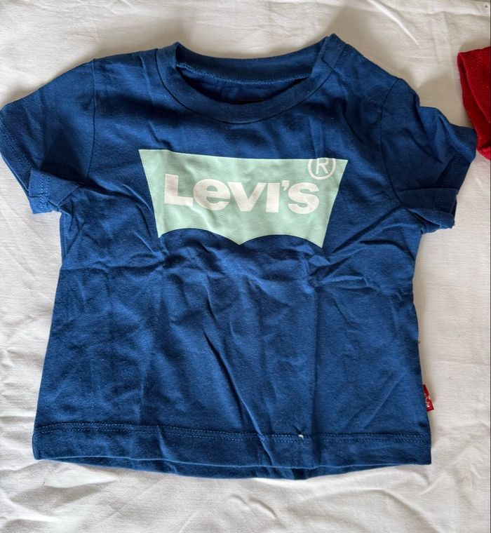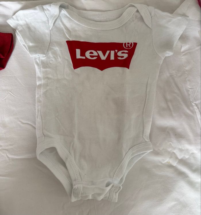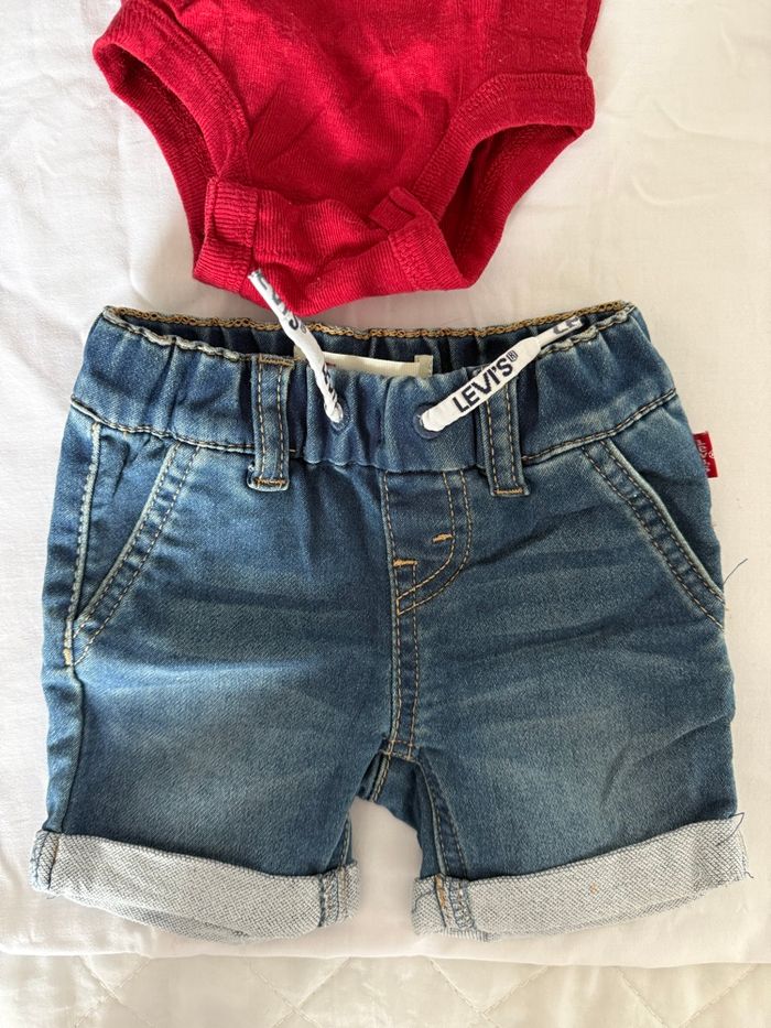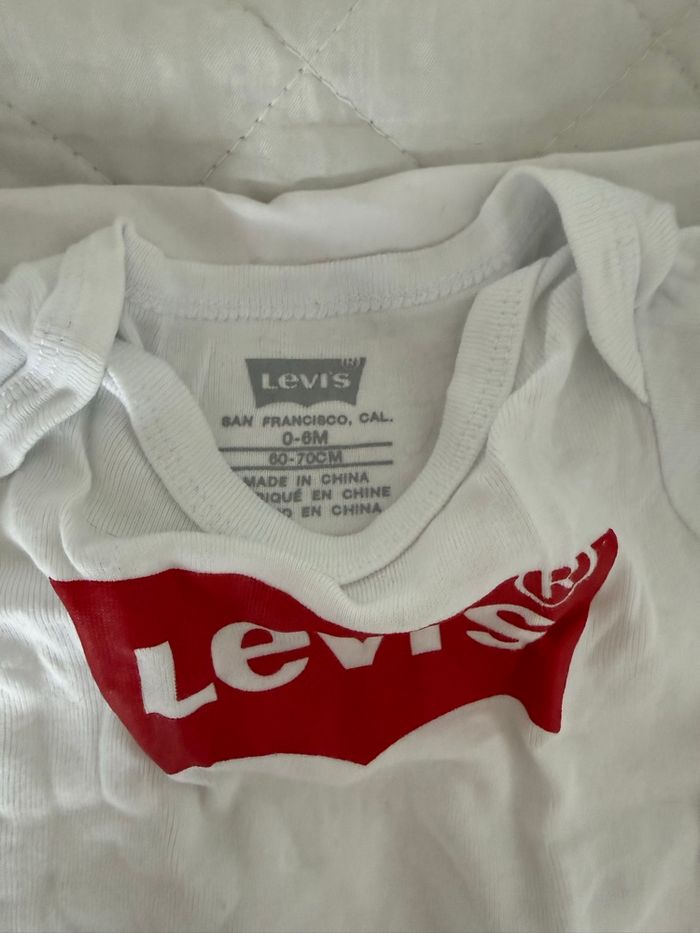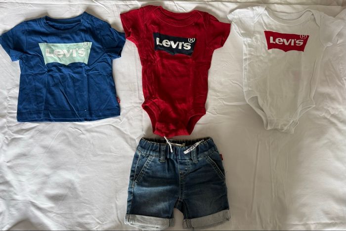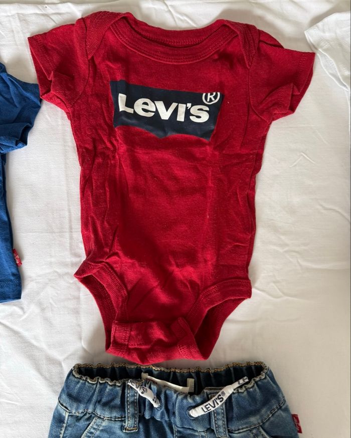 Lot comprenant 2 bodies Lévis en taille 0-6mois 1 short en jeans Lévis 3mois 1 teeshirt Lévis 3mois En excellent état car quasiment pas porté.