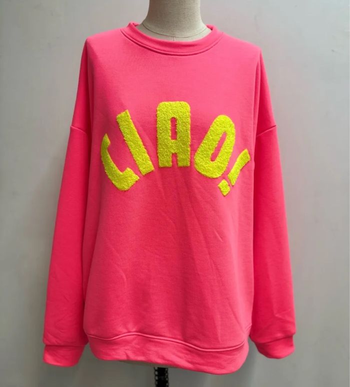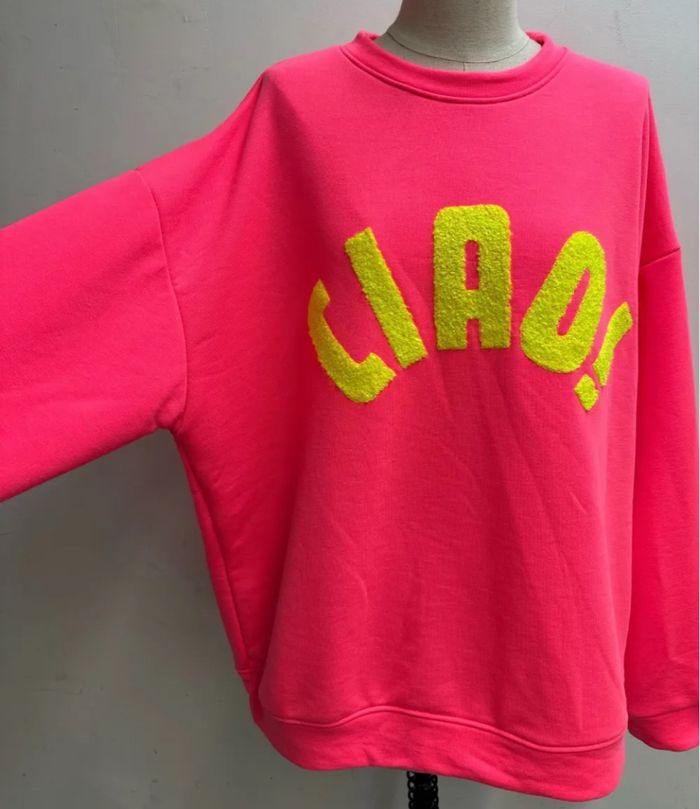Magnifique sweat très tendance avec col rond et manches longues , imprimé devant Taille unique qui va jusqu’à 46 Largueur sous aisselles 68 cms