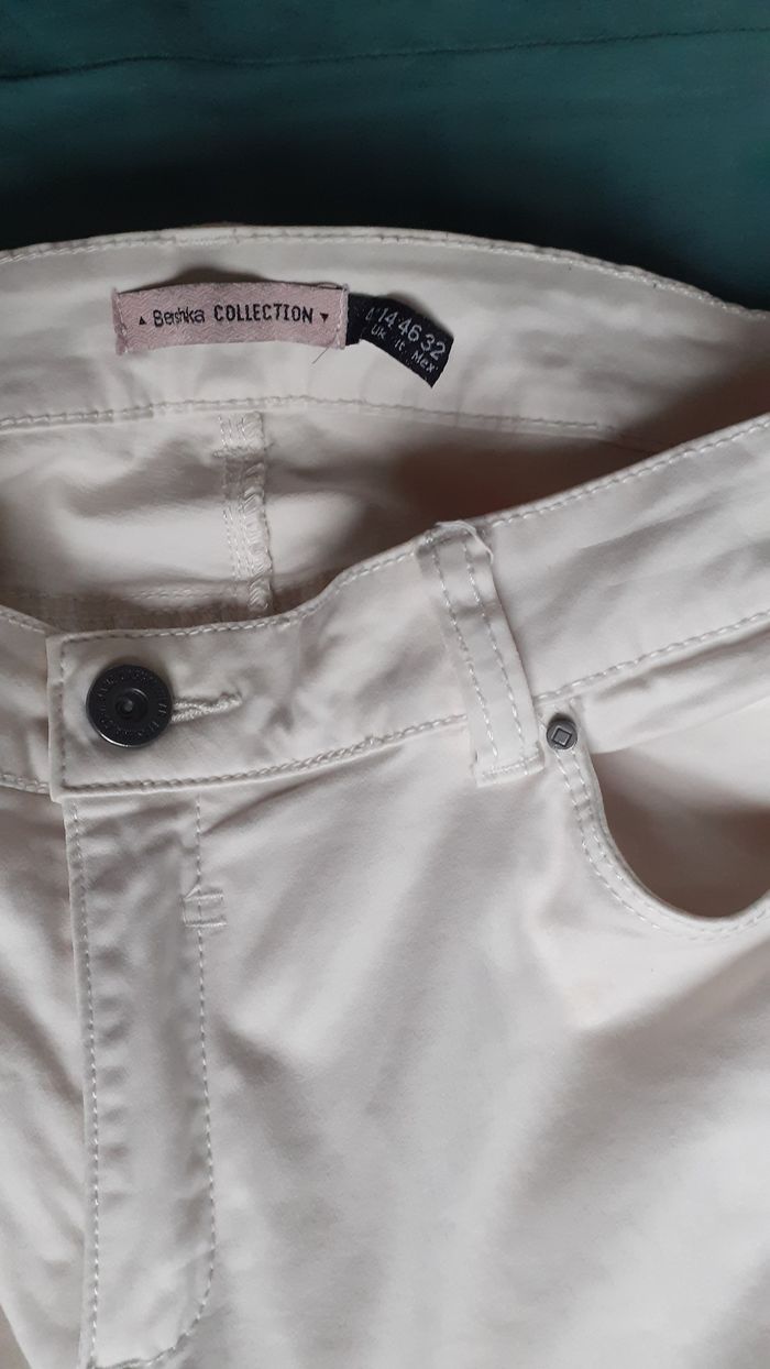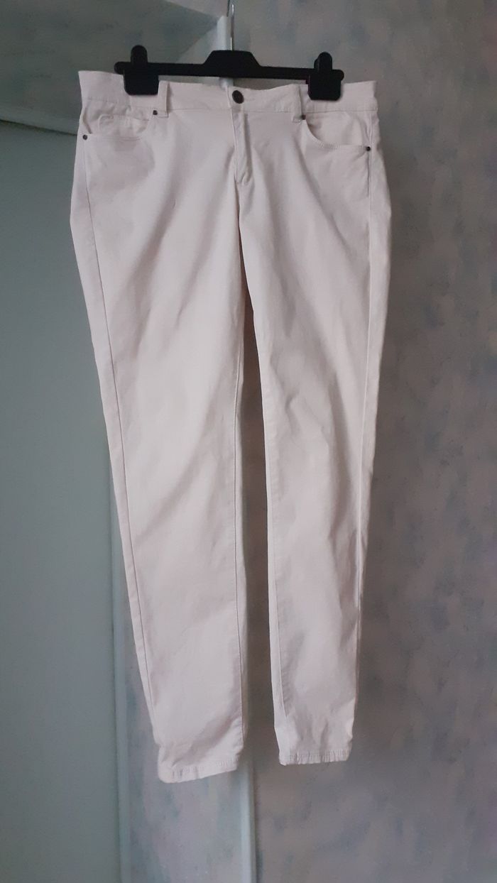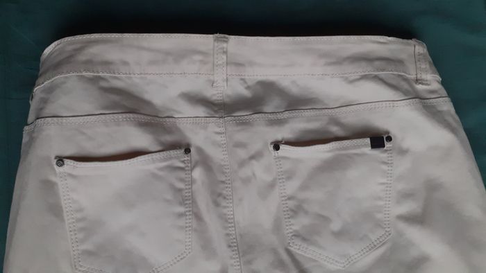 Vends un pantalon coupe jean, taille basse, 96 % coton, 4 % élasthanne, couleur crème, marque Bershka Collection, taille 42 EUR. Longueur entrejambe : 73 cm Largeur de la ceinture à plat : 43 cm.