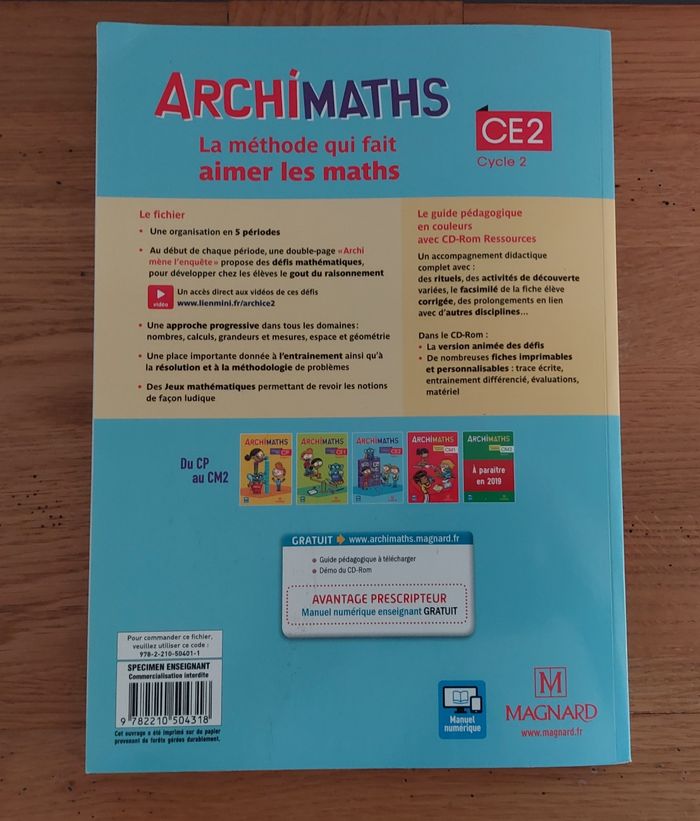 CE2 cycle 2 Archimaths La méthode qui fait aimer les Maths Spécimen Enseignant Magnard Très bon état sauf haut à droite coin corné Aucune inscription