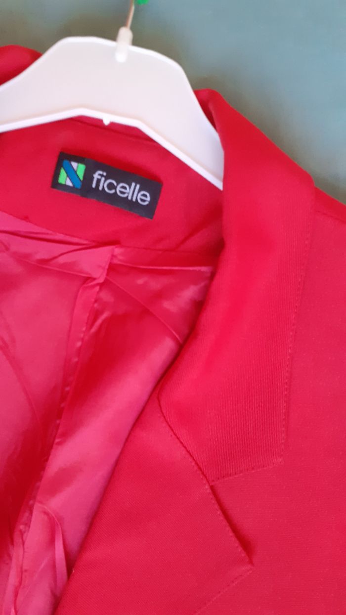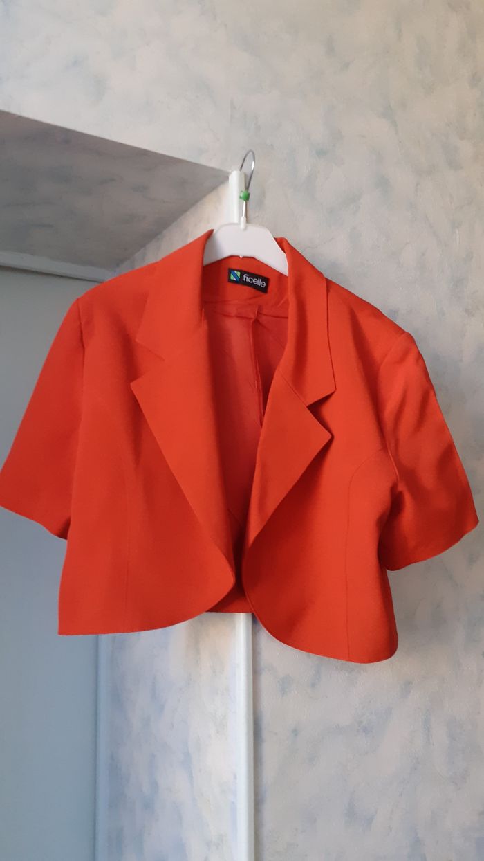 Vends un blazer court sans boutonnage, manches courtes, doublé, 30 % polyester, 70 % viscose, couleur rouge, marque Ficelle, taille 1 sur l'étiquette, 40-42 d'après les mesures. Longueur de l'épaule à la base : 44 cm Largeur aisselle à aisselle : 54 cm.