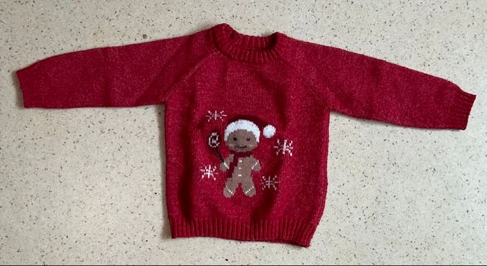 Pull en laine rouge avec bonhomme pain d’épice, Kiabi, 24 mois. En parfait état.