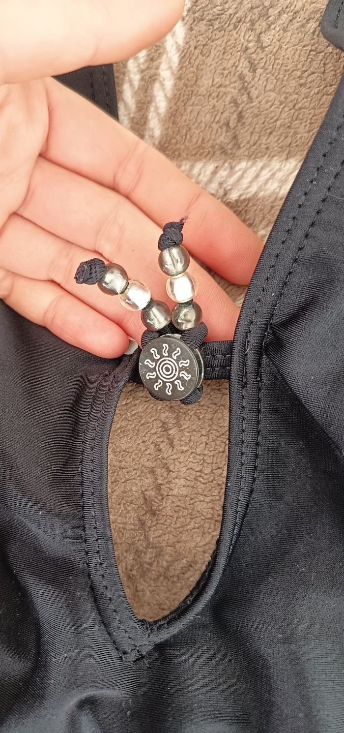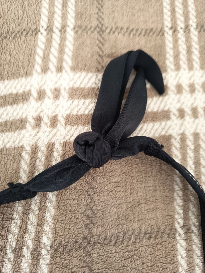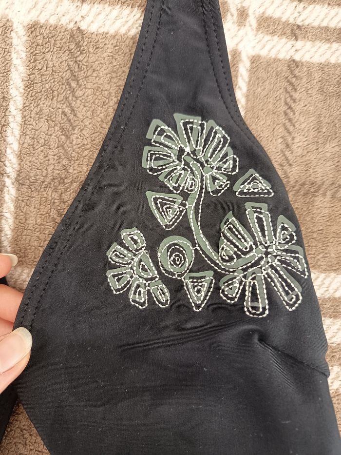 - Couleurs : Noir, Gris, Blanc - Doublure : Beige 👉🏼 2ème 📸 : S'attache au niveau de la nuque 👉🏼 3ème 📸 : Motifs de fleurs 💮 👉🏼 4ème 📸 : Petit "bijou" décoratif 🧶 : Matière Principale : 80% Polyamide (= Nylon), 20% Élasthane / Doublure : 100% Polyester 🔸Défauts🔸 👉🏼 Dernière 📸: 1 petit endroit décousu derrière