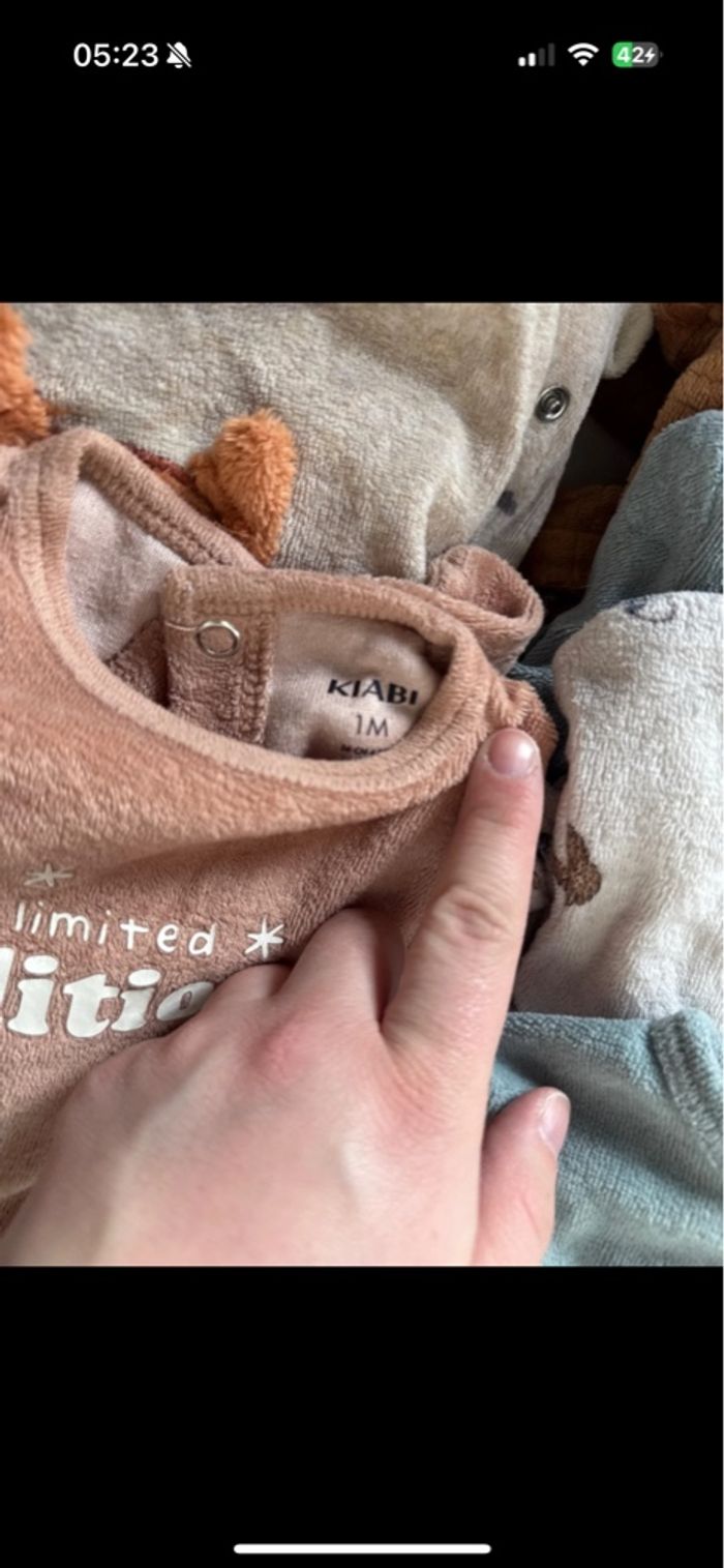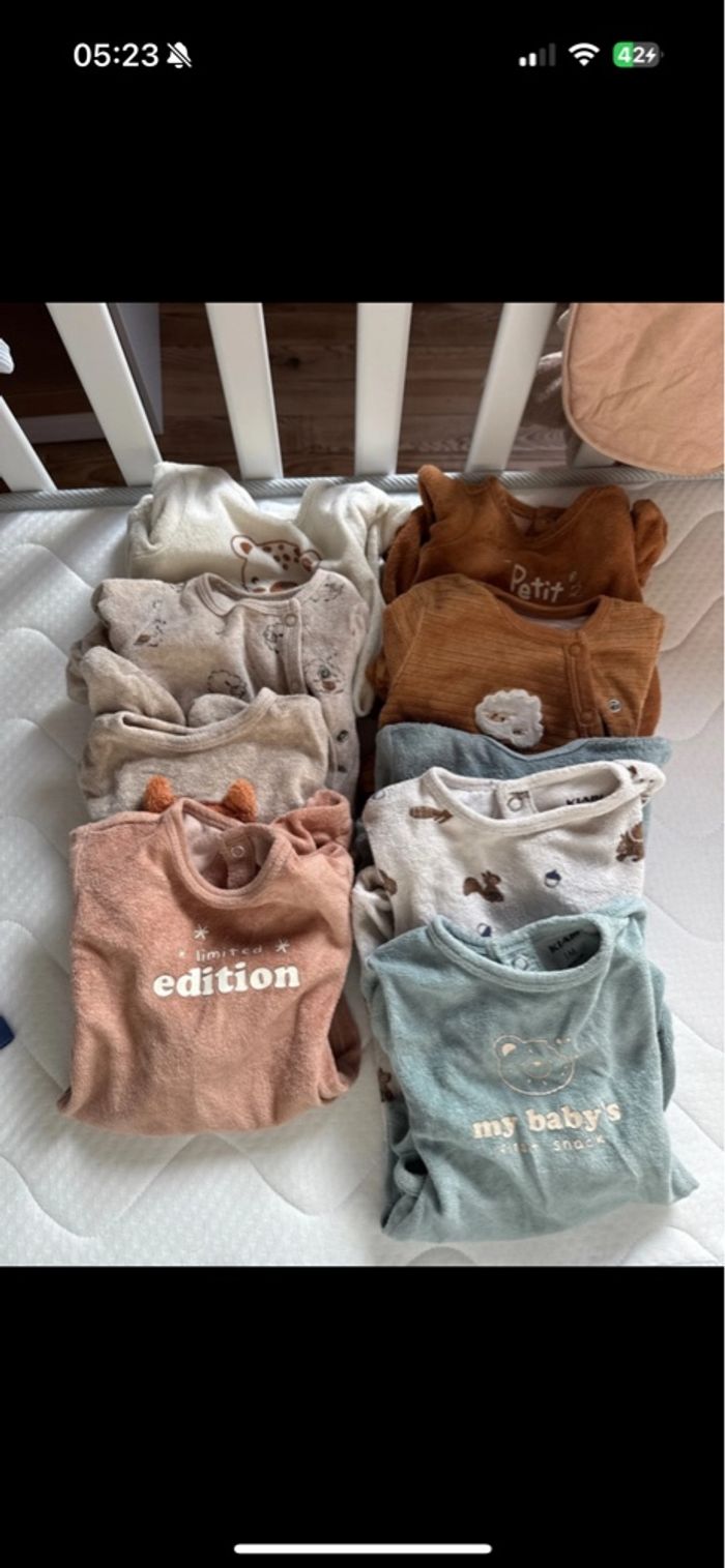 Lot de 9 pyjamas Deux pyjamas identiques (le bleu) Je donnerais d’autres pyjamas dans le lot (je ne les vends pas car c’est des dons) Kiabi-Orchestra 1 mois