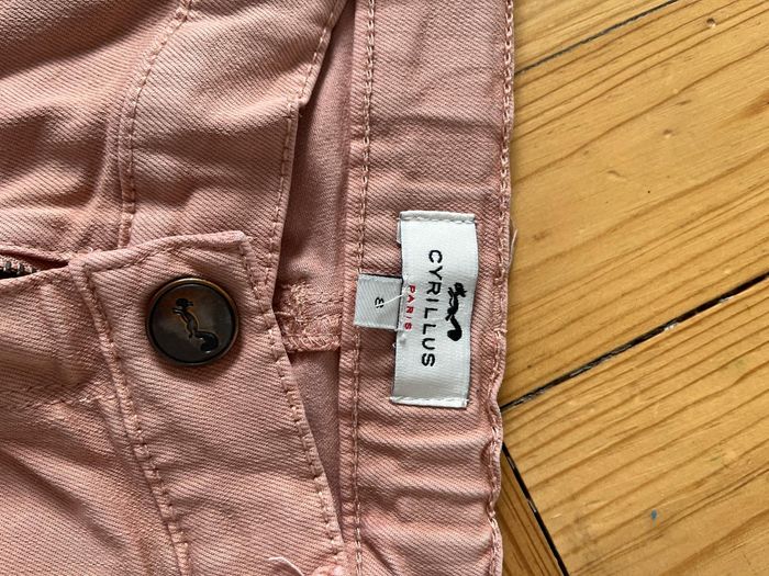Deux pantalons Cyrillus: un jean rose moyen et un tregging bleu. Très bon état général, mais genoux pas impeccables. Un tregging rose clair H&M, tissu en très bon état mais petites taches, discrètes (voir photos)