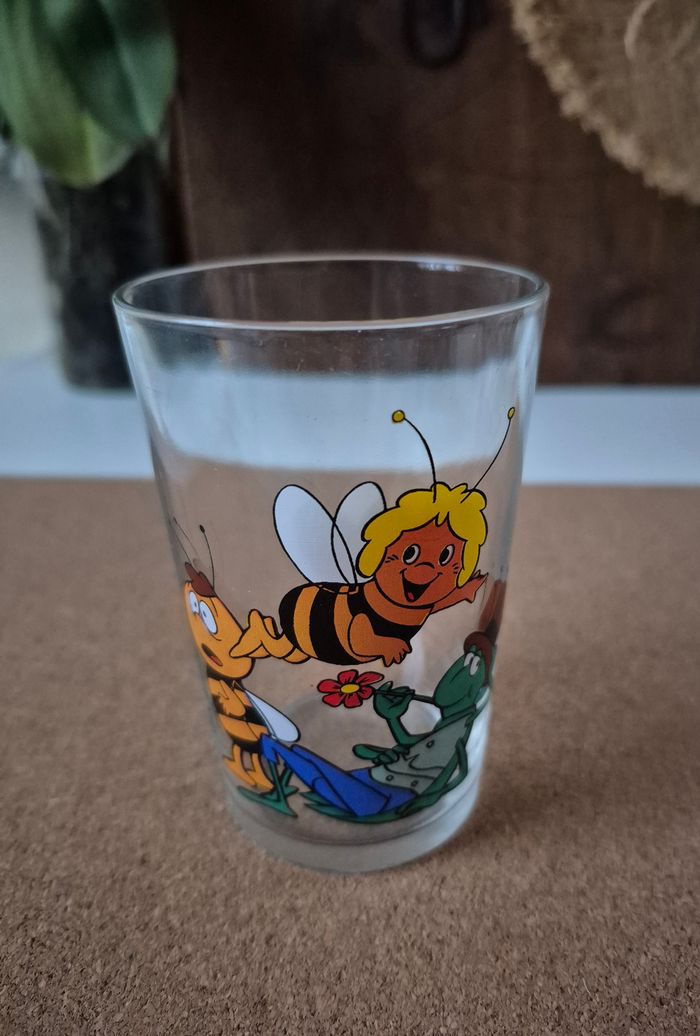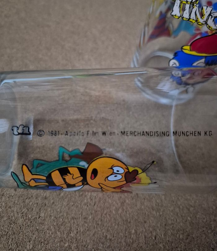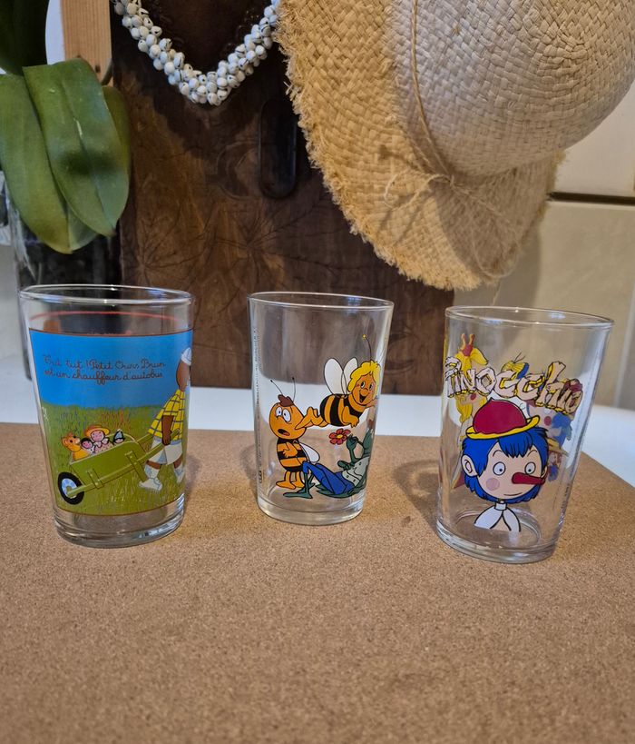 Lot de 3 verres à eau -1 Pinocchio - 1 Maya l'abeille (Tf1) - 1 Pomme d'api (bayard presse) Hauteur 10 cm., diamètre 65 cm.